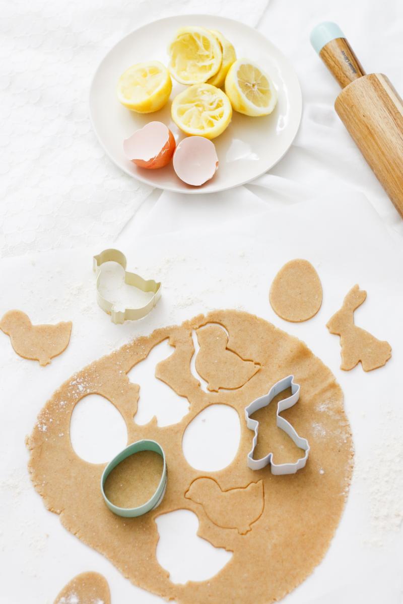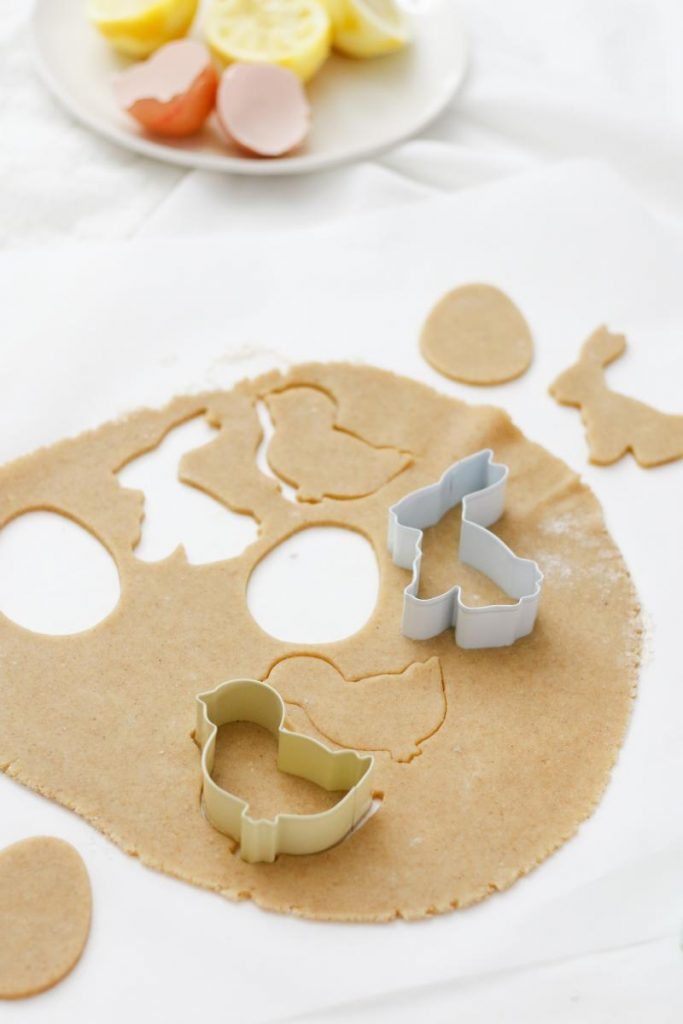 - Den Teig auf einer leicht bemehlten Arbeitsfläche ausrollen (ca. 3-4 mm dick) und Ostereier oder andere beliebige Osterformen ausstechen.