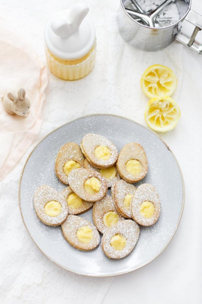 - Je zwei Kekse mit Lemon Curd zusammensetzen und mit Puderzucker besieben.