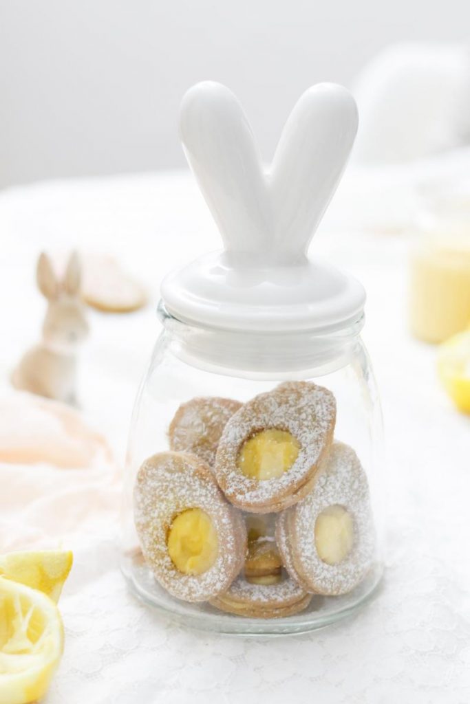 Diese zarten Kekse sind ein feines Geschenk und Mitbringsel für liebe Menschen, die ihr zu Ostern beglücken möchtet. Als Verpackung eignen sich die Vorratsgläser mit Hasenohren besonders schön. Wer würde sich darüber nicht freuen? :)