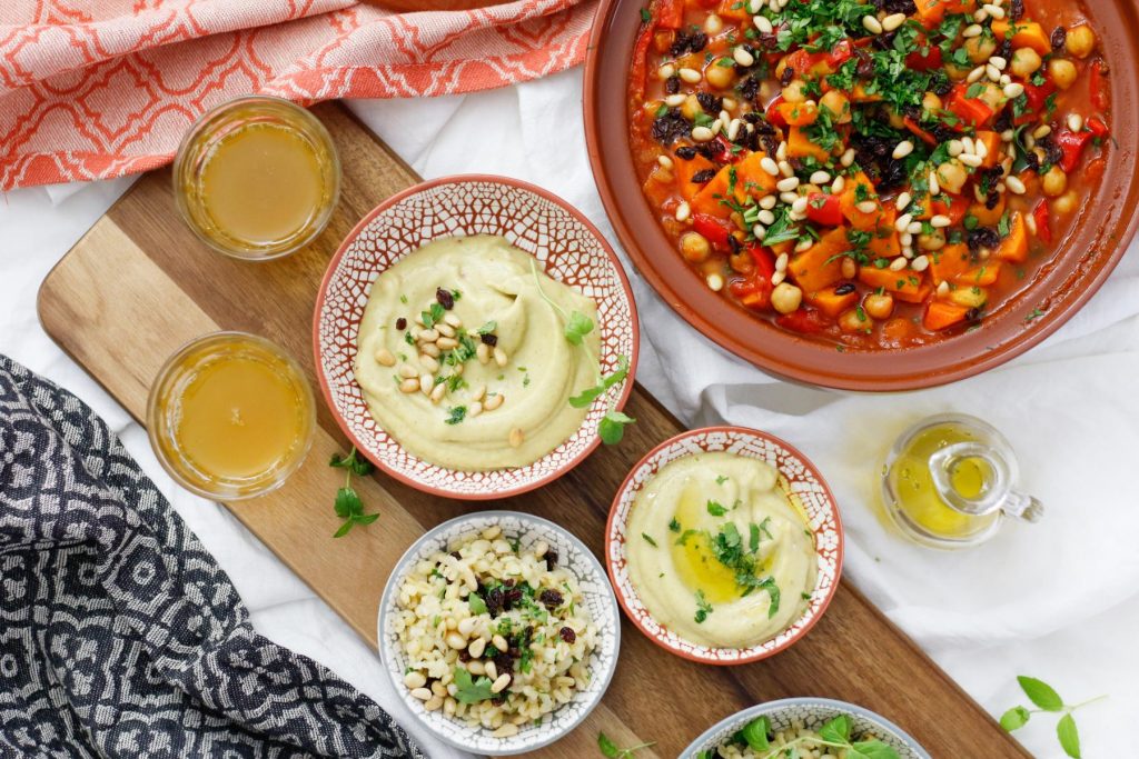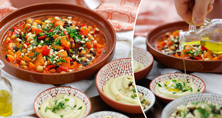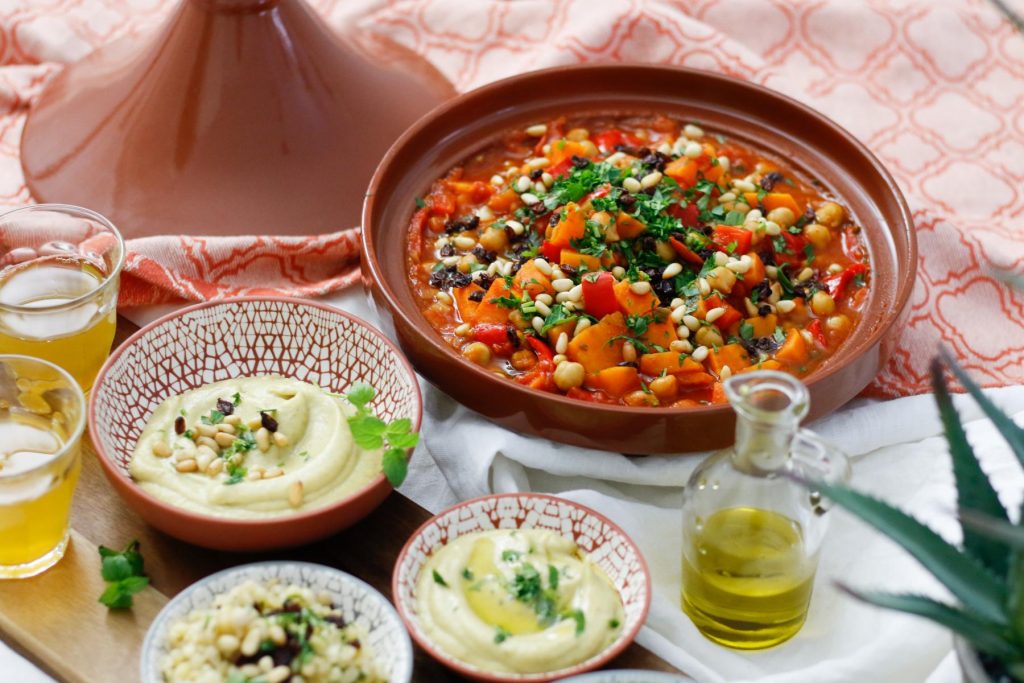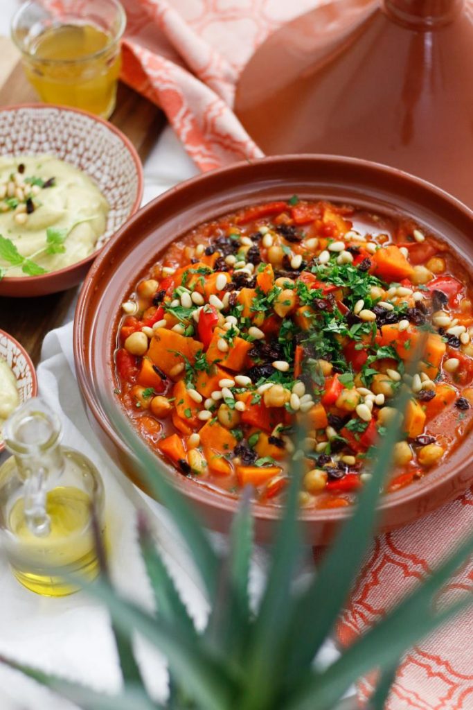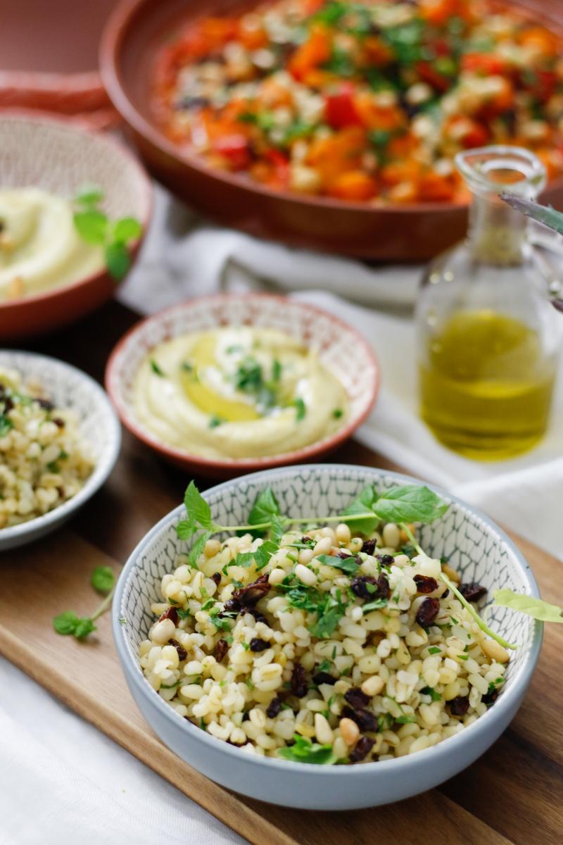 Süßkartoffel-Kichererbsen-Tajine mit Kräuter-Berberitzen-Bulgur und Baba Ganoush