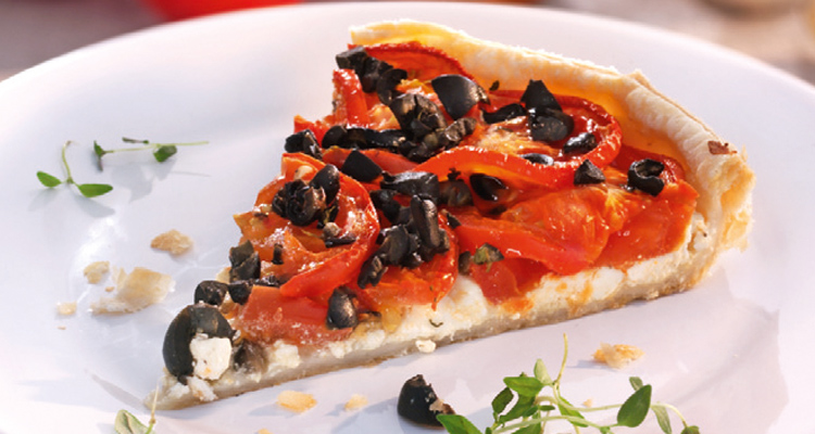 Den Blätterteig leicht ausrollen und die Form damit auskleiden. Mit dem Senf bestreichen. Dann den Schafskäse darüberstreuen. Die Tomatenscheiben aufl egen, salzen und pfeffern, dann die Oliven und die Thymianblättchen daraufstreuen. Mit der Olivenöl-Knoblauch-Mischung beträufeln und auf der mittleren Schiene ca. 40 Minuten backen.