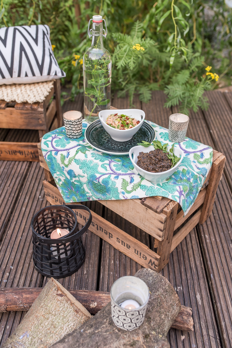 Als Deko habe ich jede Menge Windlichter, Teelichthalter, Decken und Kissen verteilt, damit es auch nach Einbruch der Dunkelheit noch herrlich gemütlich ist.