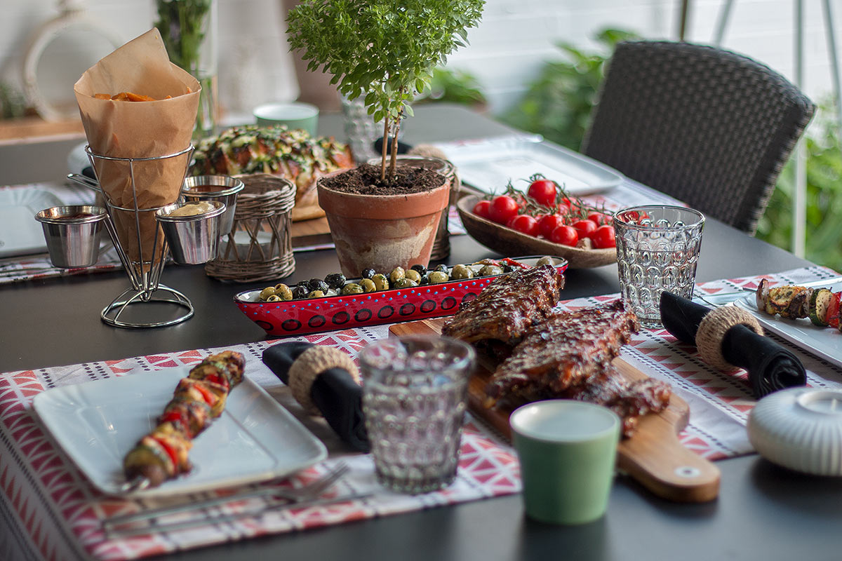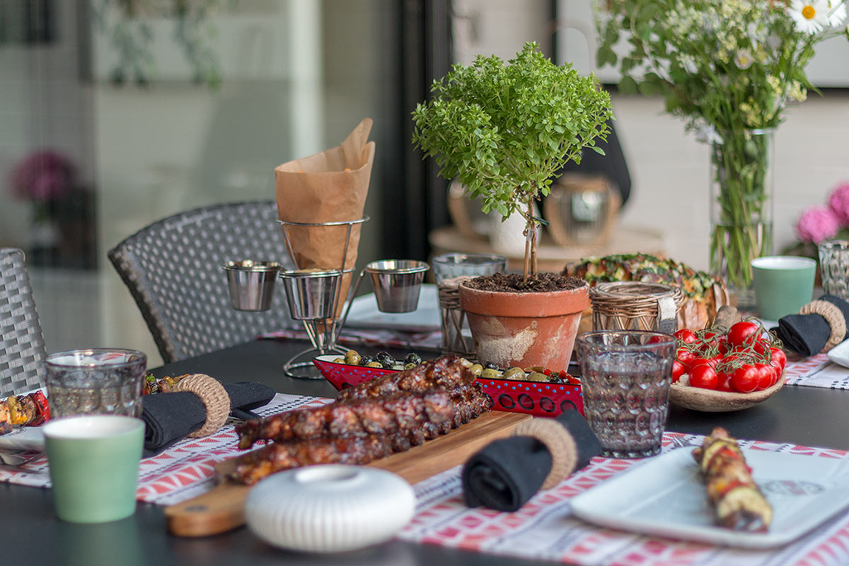 Auch eingelegte Oliven sind ein Muss zum Grillen. In dem hübschen Olivenboot Mexiko machen sie richtig was her. Dazu passt hervorragend der Tischläufer aus der gleichnamigen Serie. Nicht nur zu Burgern, sondern auch zum Grillen bereite ich liebend gerne Süßkartoffelpommes zu. Diese machen sich perfekt im Pommeshalter. In den drei dazugehörigen Dipschälchen lassen sich prima selbst gemachte Saucen oder Mayo einfüllen. Schön zum Anrichten und toll für einen Grillabend mit Freunden oder der Familie sind diese Teller mit „HOT BBQ“ Aufdruck. Für das Zupfbrot sowie die Rippchen habe ich diese Servierbretter aus Akazienholz verwendet. Diese lassen sich prima reinigen. Auch auf dem Tisch machen sie eine gute Figur. Mein kleines Basilikumstämmchen aus dem Gartencenter darf mittlerweile bei keiner Outdoor-Tischdeko mehr fehlen. In der Mitte platziert, fügt es sich in jede Tischdekoration prima ein.