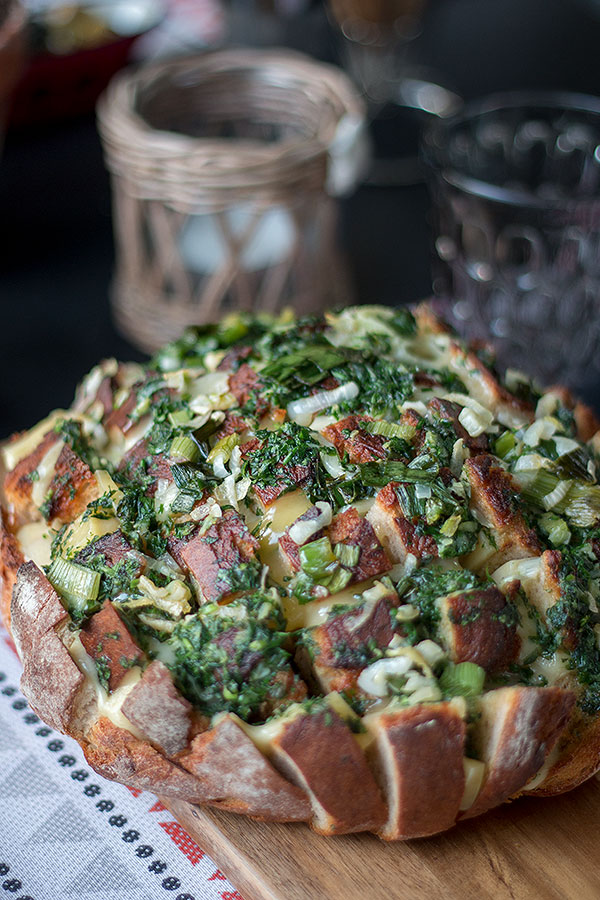 - Zupfbrot mit flüssiger Kräuterbutter übergießen und Frühlingszwiebeln darauf verteilen