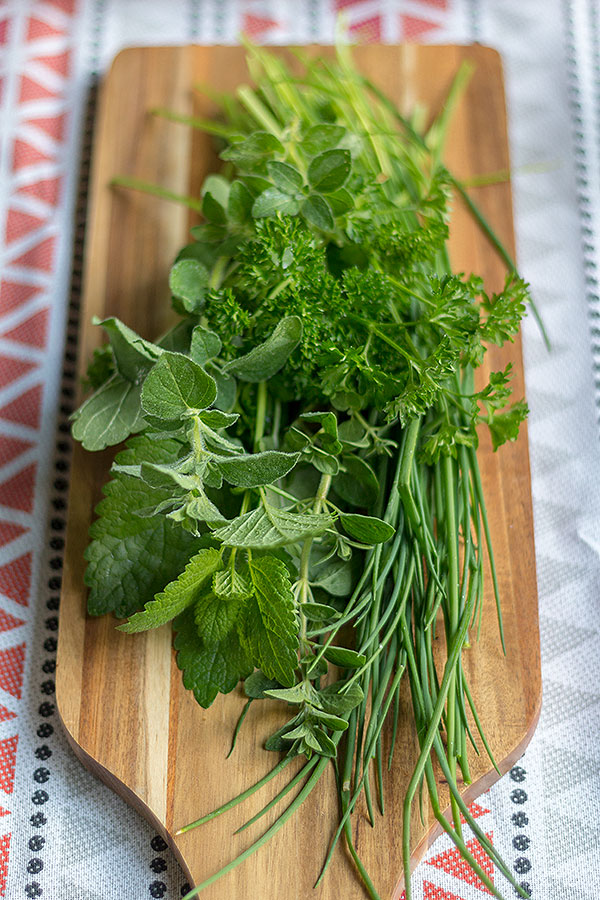 - Kräuter waschen, trocken schütteln und klein hacken.