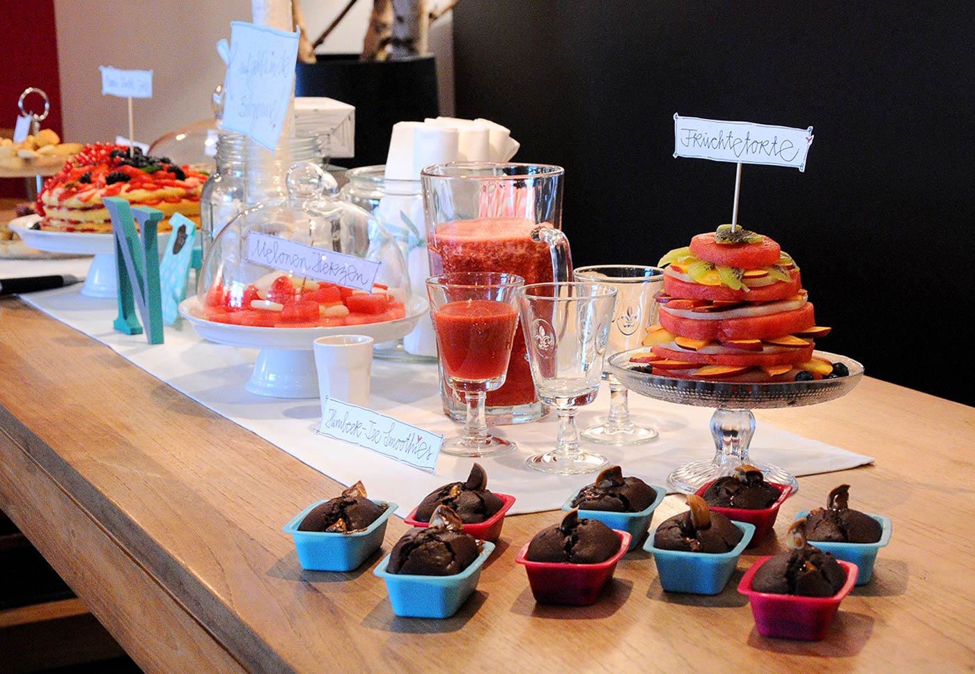Alle Naschereien hatte ich natürlich standesgemäß auf DEPOT Glockenplatten, Etageren und Krügen gepackt. Ihr seht sicher selbst, dass hübsches Porzellan in Verbindung mit farbenfrohen Nachtischen einfach einen Augenschmaus ergeben.