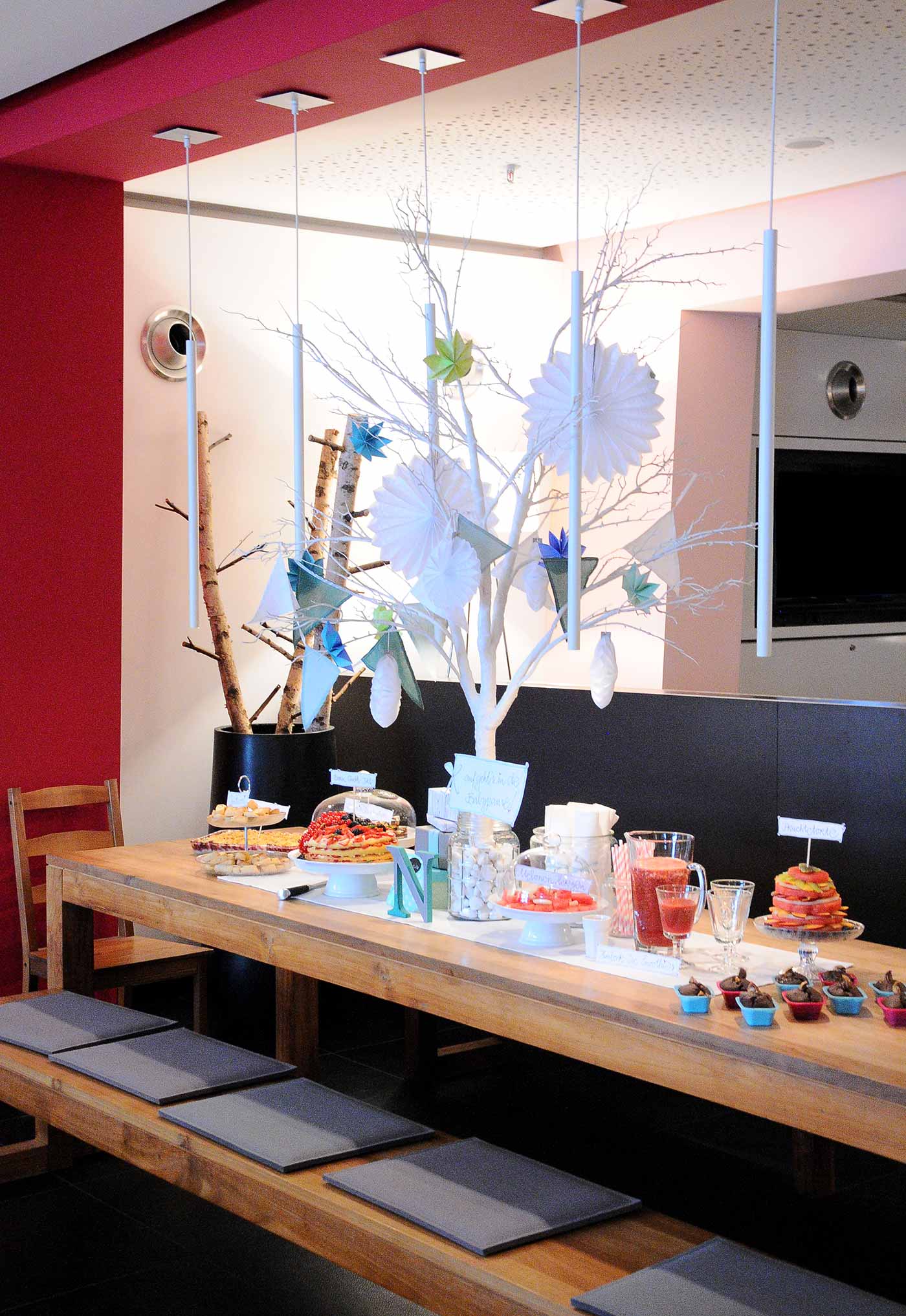 Gemeinsam mit Marian -eine unserer wundervoll, kreativen Visual Merchandiser- deckten wir eine unserer schönen Holztafeln. Ein weiß gestrichener Ast mit einigen Pompons und einer kleinen Wimbel-Kette passten farblich perfekt zu Kuchen und Ambiente.