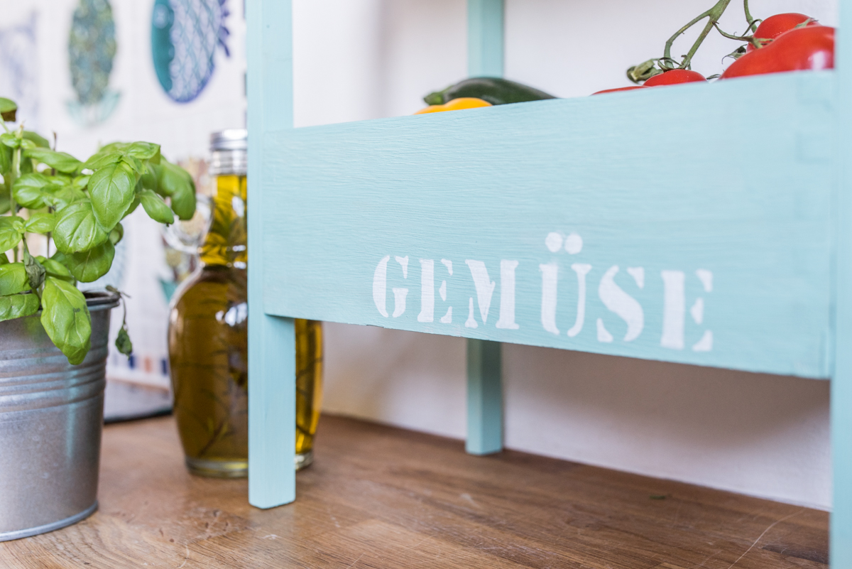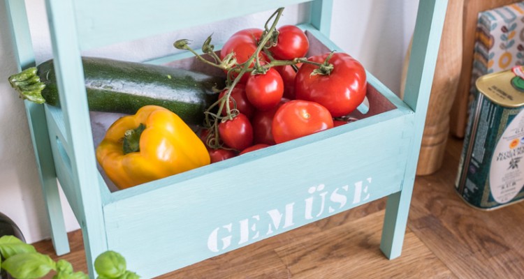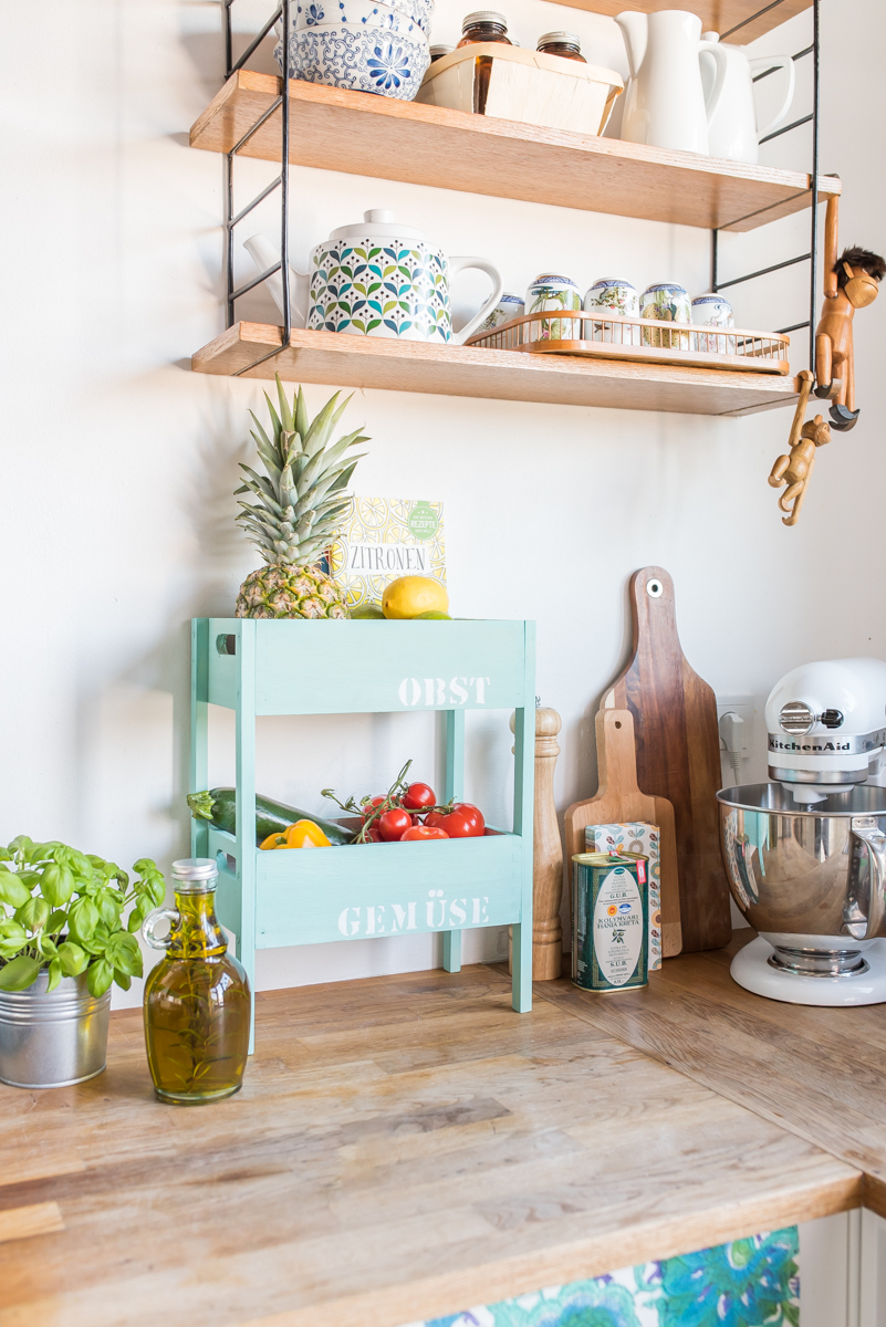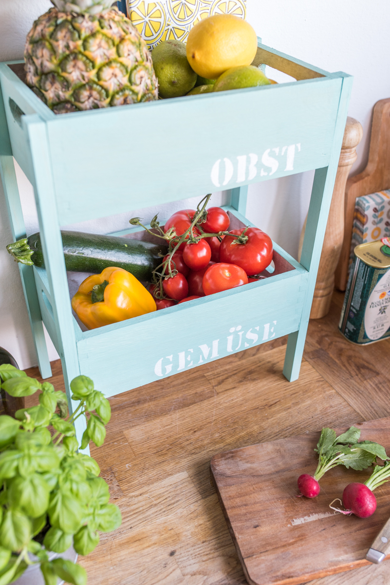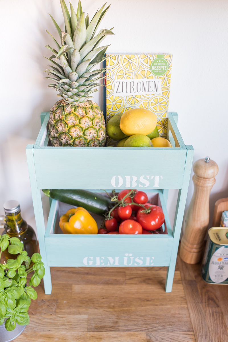 Endlich ist der Frühling da und mit ihm die Lust auf frisches, knackiges Gemüse und leckeres Obst! Bei so einem leckeren Angebot auf dem Wochenmarkt bekomme ich schon mal Platzprobleme in der Küche, deshalb habe ich eine einfache Etagére für Obst und Gemüse gebaut, in die unser Wocheneinkauf locker reinpasst.