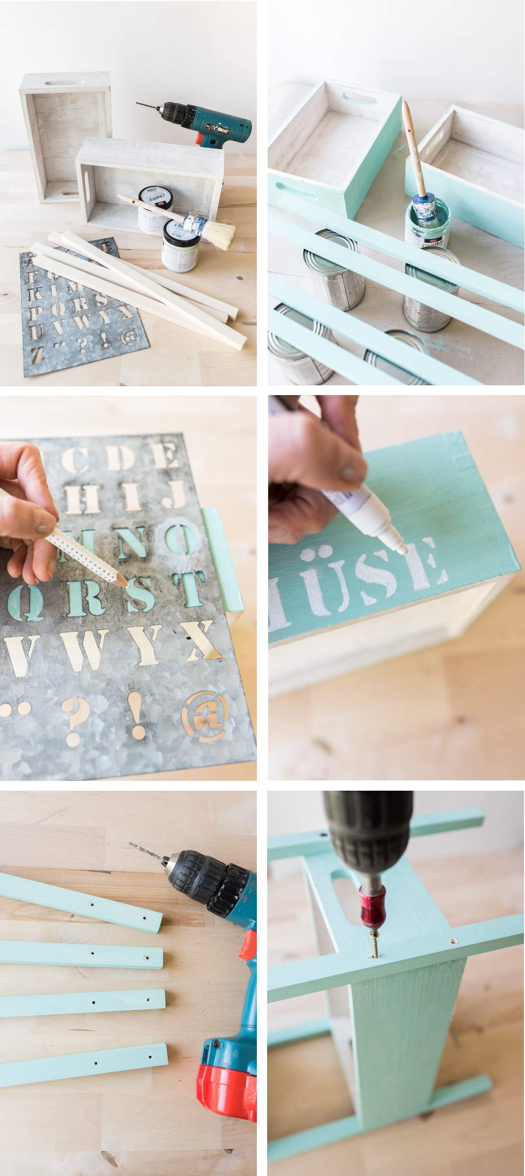 Bei DEPOT habe ich Holzboxen gefunden, die ich mit ein paar Leisten aus dem Baumarkt und etwas Farbe in eine Etagére verwandelt habe!