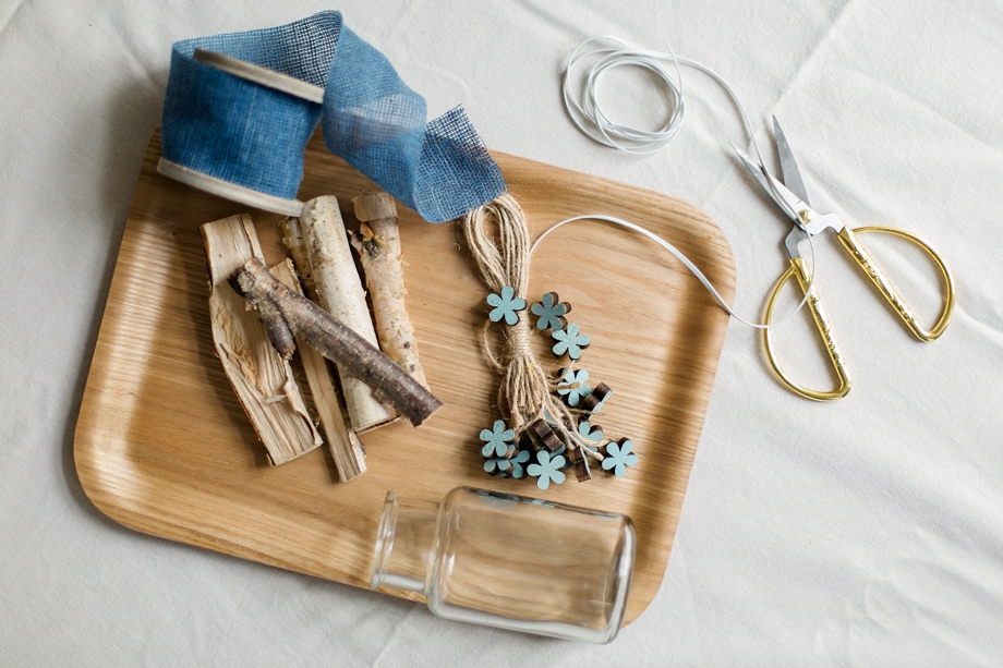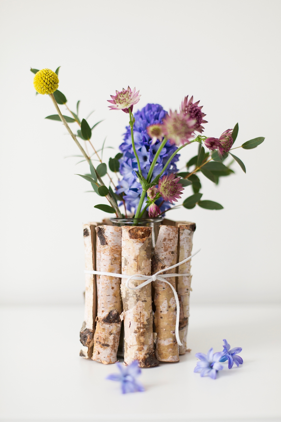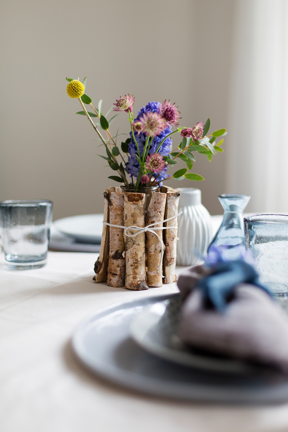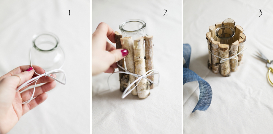 Um die Vase das Band in Lederoptik binden, dabei darauf achten genug Platz zwischen Schleife und der Vase lassen damit die Birkenholzstücke genügend Platz haben. Danach nach und nach die Stücke zwischen Band und Glasvase stecken und darauf achten , sie akkurat nebeneinander zu stellen. Falls die Weite zu klein sein sollte, kann man diese nachträglich vergrößern in dem man die Schleife neu bindet. Es geht leichter wenn man eine Hilfe zur Hand hat, kann aber auch ganz easy allein durchgeführt werden. Wenn alle Stücke um die Vase gesteckt sind, sollte man nochmals die Schleife etwas fester binden, damit die Birkenholzstücke nicht unten durchflutschen. Anschließend die Vase mit Wasser befüllen und hübsche Frühlingsblumen nach Lust und Laune in der DIY Birkenholzvase verteilen. Diese Idee ist sehr schnell umsetzbar und sieht auch wunderhübsch aus für eine Vintage DIY Hochzeit.
