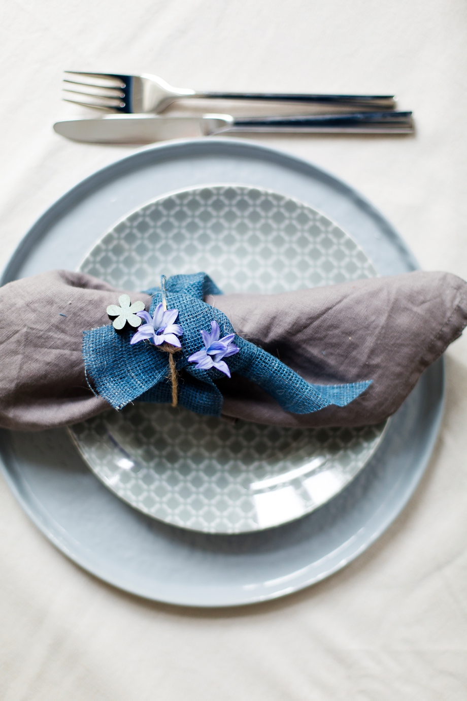 Anschließend den Tisch decken. Hierfür hab ich farbig passende Platzteller verwendet auf die ich schöne gemusterte Dessertteller von DEPOT platzierte. Um der Tischeko noch mehr Leben einzuhauchen, band ich um die Stoffservietten eine großzügige Schleife mit dem blauen Juteband und darüber drappierte ich die Streudeko Anhänger in Blau mit Blümchen. Zu guter Letzt legte ich noch ein paar einzelne Blüten der Hyacinthen auf die Serviette – sozusagen als frühlingshaften Gruß für die Gäste. Das sieht nicht nur hübsch aus sondern durftet einfach himmlisch!
