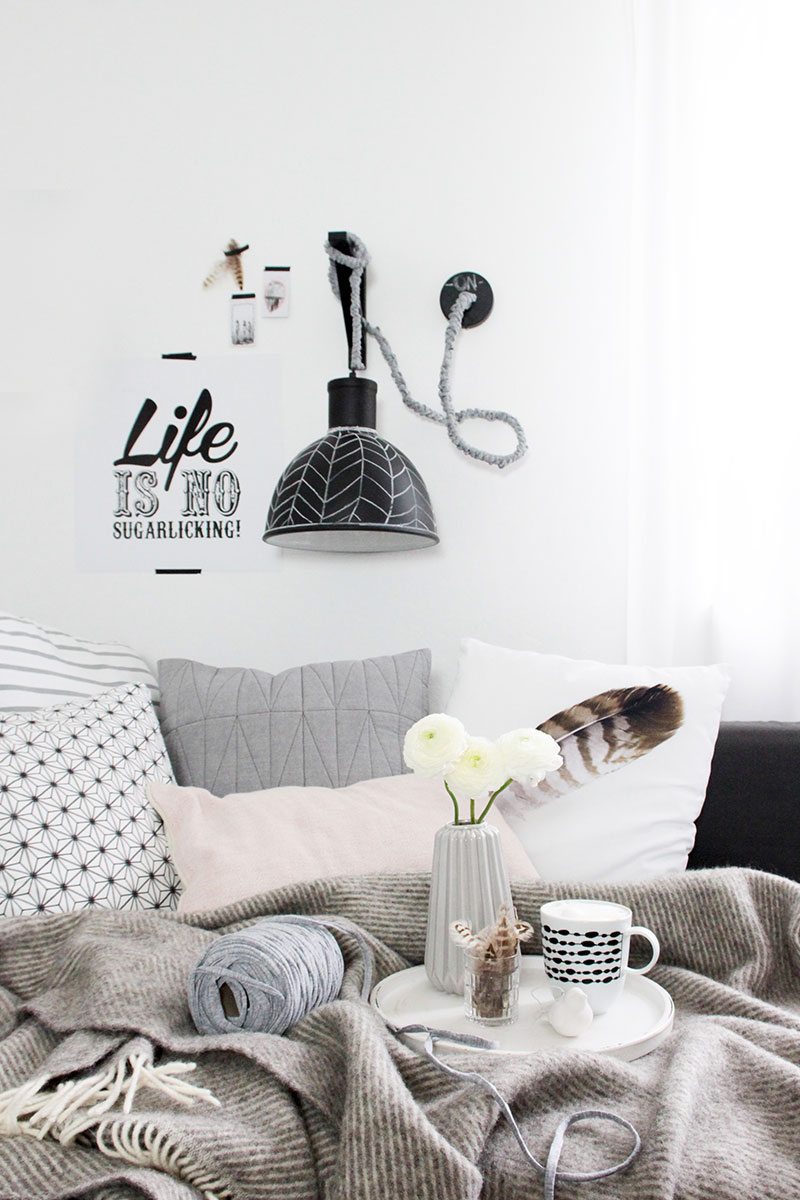 Ich mache es mir jetzt mit einem guten Kaffee, vielen Kissen (hier gibt es übrigens eine tolle Auswahl) und neuer DIY Wandlampe als Leselicht gemütlich. Eure Mona