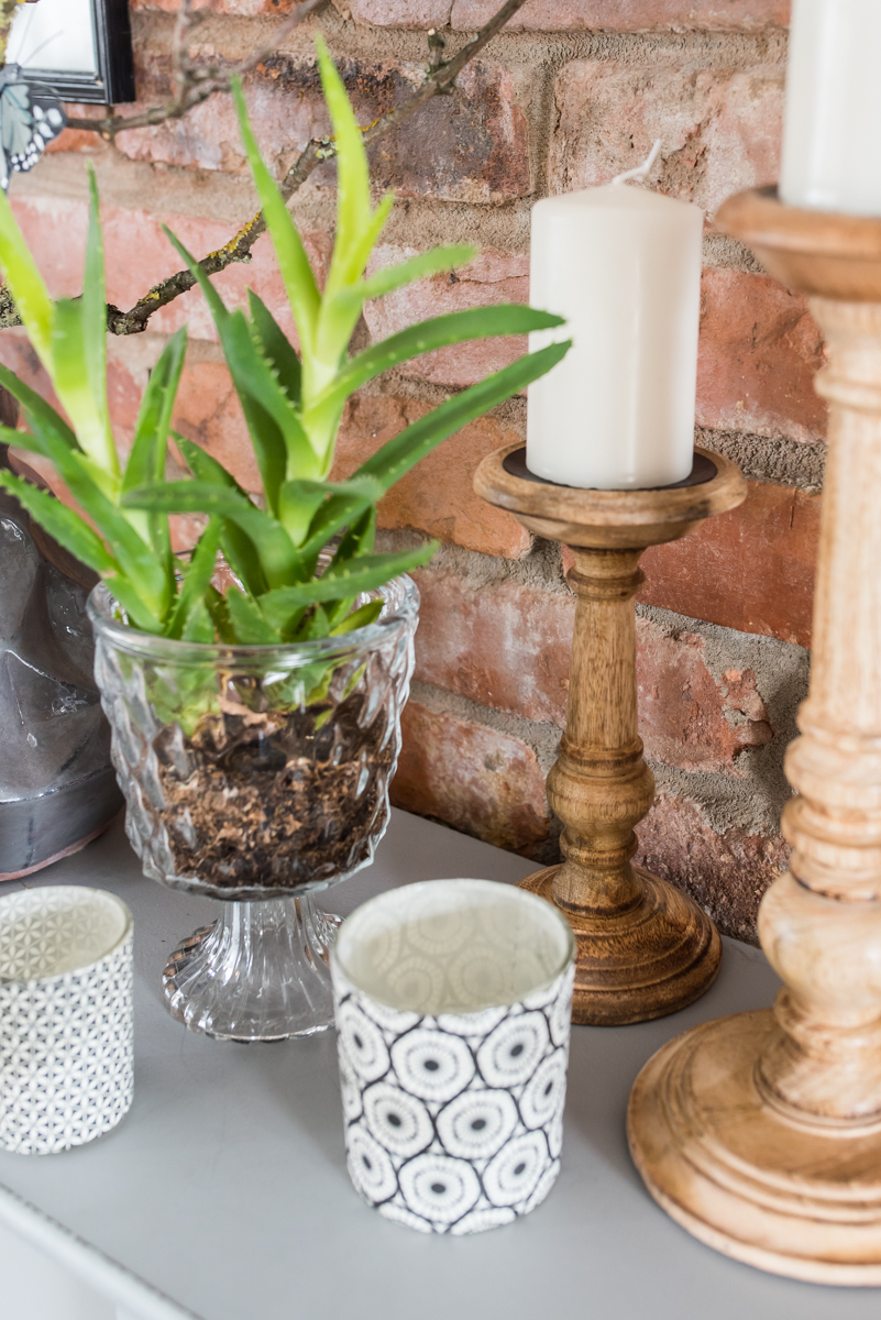 Bei mir steht die Kaminkonsole an der Backsteinwand, aber sie wirkt auch Klasse vor einer schlichten weißen Wand und kann für jede Jahreszeit anders dekoriert werden – ein echtes kleines Universalmöbel :)!