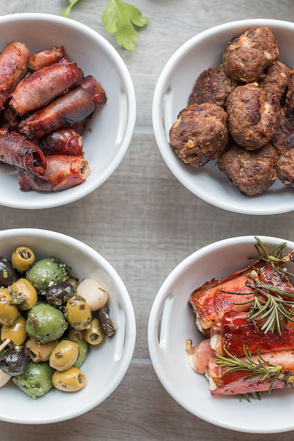 Die Pflaumen im Speckmantel lassen sich auch ganz easy herstellen. Einfach mageren Speck fest um die Pflaumen wickeln und in etwas Öl in einer Pfanne bei mittlerer Hitze von allen Seiten goldbraun anbraten. Wenn ihr noch etwas Geduld mitbringt, dann verrate ich euch in ein paar Tagen auf Stylish Living auch die Rezepte zu den Runzelkartoffeln, Hackbällchen und dem Ziegenkäse im Schinkenmantel.