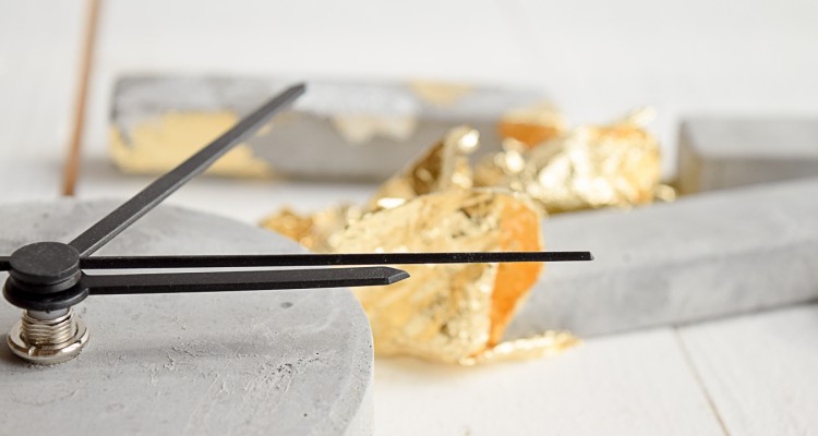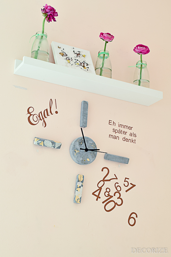 Da das pure Beton und die Gradlinigkeit dieser Wanduhr vom DEPOT bei uns nicht so gut in den Einrichtungsstil der Küche passt, haben wir sie ein wenig aufgerüscht. Mit Blattgold und -Silber. Und sie hat dann doch noch Gesellschaft von ihren Zahlen bekommen – in Form von bronzefarbener Klebefolie, um den Innenton der Küchenlampe aufzunehmen.