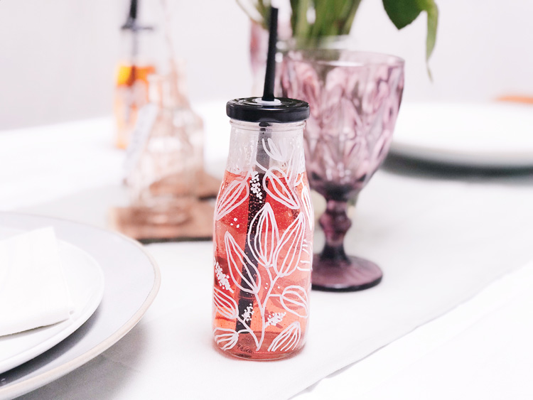 Das erste Flaschendesign besteht aus vielen Blättern, die sich über die ganze Flasche ziehen. Mit einem weißen Marker, der eine gute Deckkraft hat, lassen sich die feinen Blätter wunderbar in einem Strich zeichnen. Dabei solltest du zunächst die Zweige am Flaschenhals entlang einmal rundum malen. Diese sollten ungefähr bis zur Mitte der Flasche ragen. Dann kannst du dasselbe vom Boden aus wieder bis zur Mitte machen. Wenn alles gut läuft, sollten sich die Zweige in der Flaschenmitte treffen. Mit ein paar Linien lässt sich eine Blattstruktur darstellen und einige Beeren hier und da lockern dein Muster zusätzlich auf.