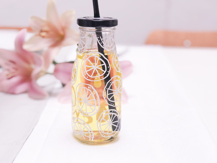 Wir haben uns ein paar Flaschen geschnappt und einige Designs ausprobiert. Was du dafür brauchst ist wirklich nicht viel – ein weißer Permanentmarker, ein Borstenpinsel und Kreidefarbe, Washitape – und schon kann es losgehen.
