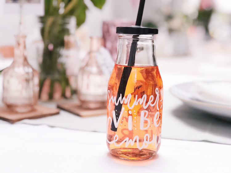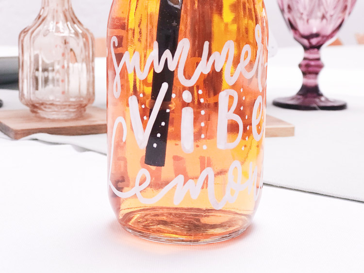 Auch mit dem Lettering-Trend lassen sich wunderschöne Muster zaubern. Dabei ist das Spiel mit verschiedenen Schriftarten besonders schön. Dafür kannst du dir zunächst einen Bereich am Flaschenbauch mit Washitape abkleben. So weißt du genau, bis wohin deine Worte ragen sollen. Beginne dann mit dem ersten Wort, was ruhig relativ groß sein kann. Anschließend kannst du – je nachdem wie viel Platz unterhalb dieses Wortes bleibt – ein oder zwei weitere hinzufügen.