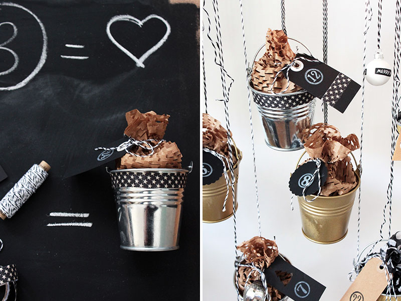- Die Zahlen mit den Nummernstempeln auf die Geschenkanhänger stempeln und mit dem Dekoband an den Eimerchen befestigen.