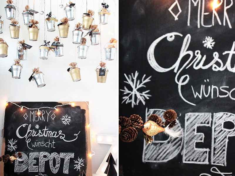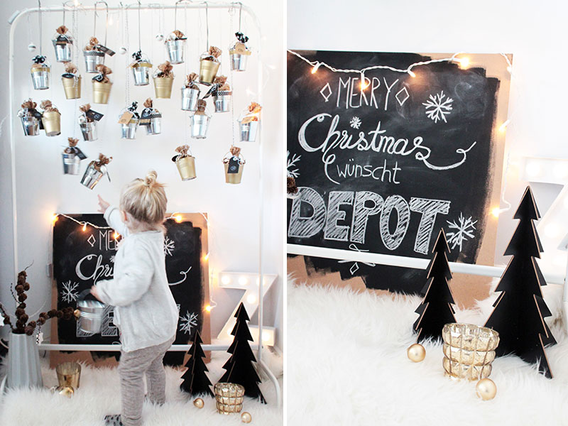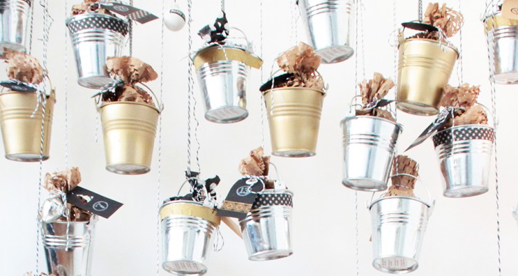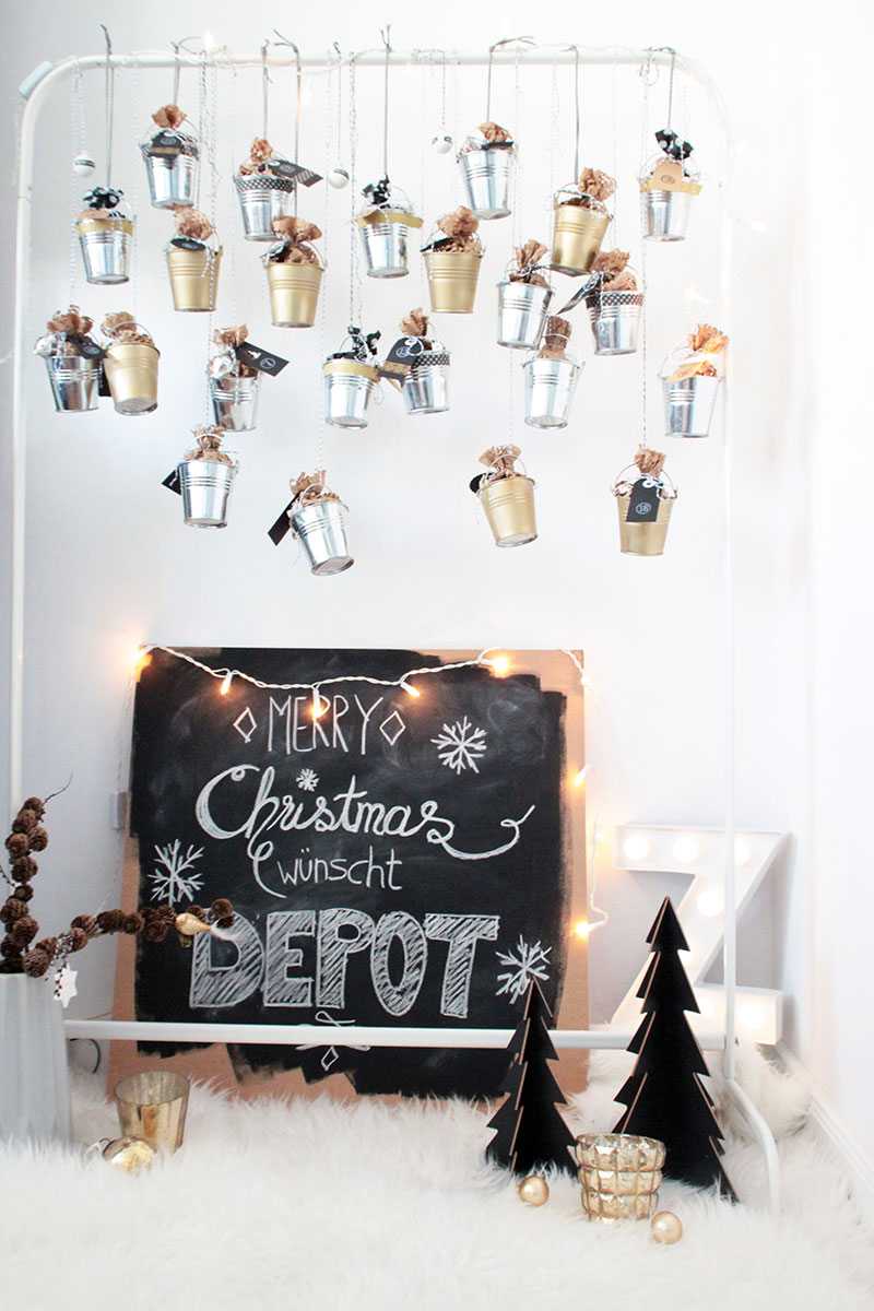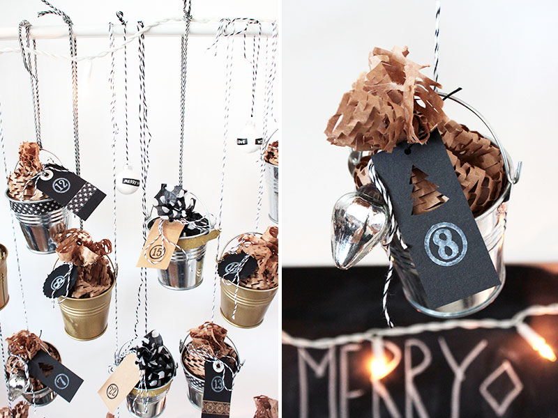 - Alle fertigen Eimerchen mit Garn an einem Ständer (z. B. einen Kleiderständer) oder auch einem großen Ast vom letzten Spaziergang aufhängen. Besonders schön sieht es aus, wenn man die Eimerchen in verschiedenen Längen befestigt. Fertig ist der DIY Adventskalender aus kleinen Blecheimerchen.
