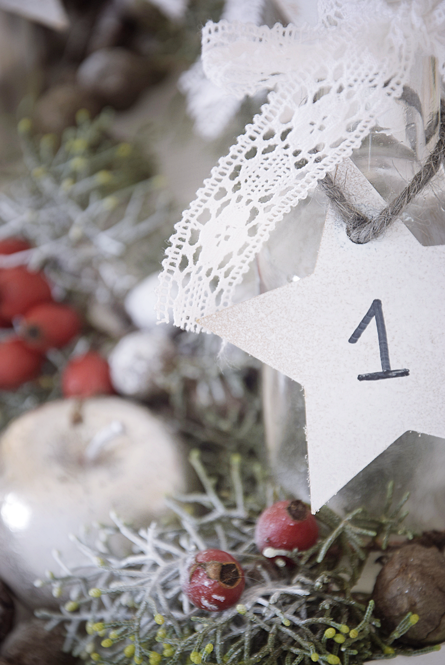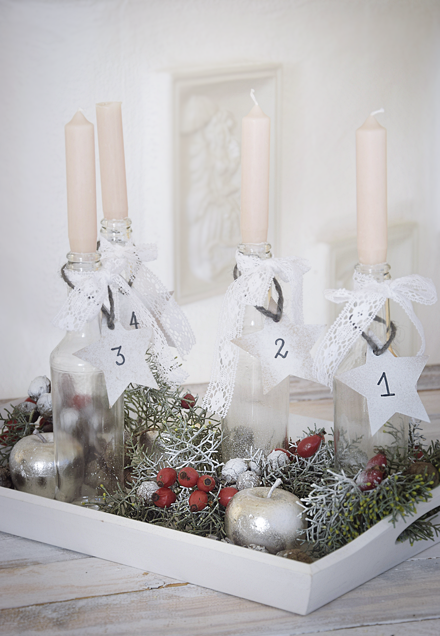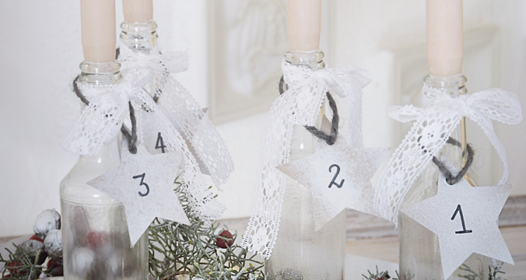 Vier Sterne aus dünnem Karton oder etwas festerem Papier ausschneiden. Mit einem Locher eine Öffnung für die Kordel ausstanzen. Mit weißem Sprühlack die Sterne besprühen. Nach dem Trocknen mit einem schwarzen Stift die Zahlen von eins bis vier aufmalen.