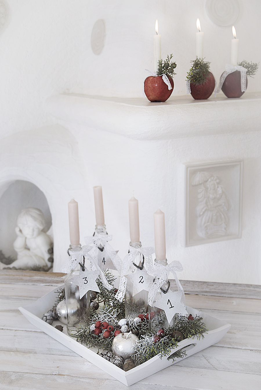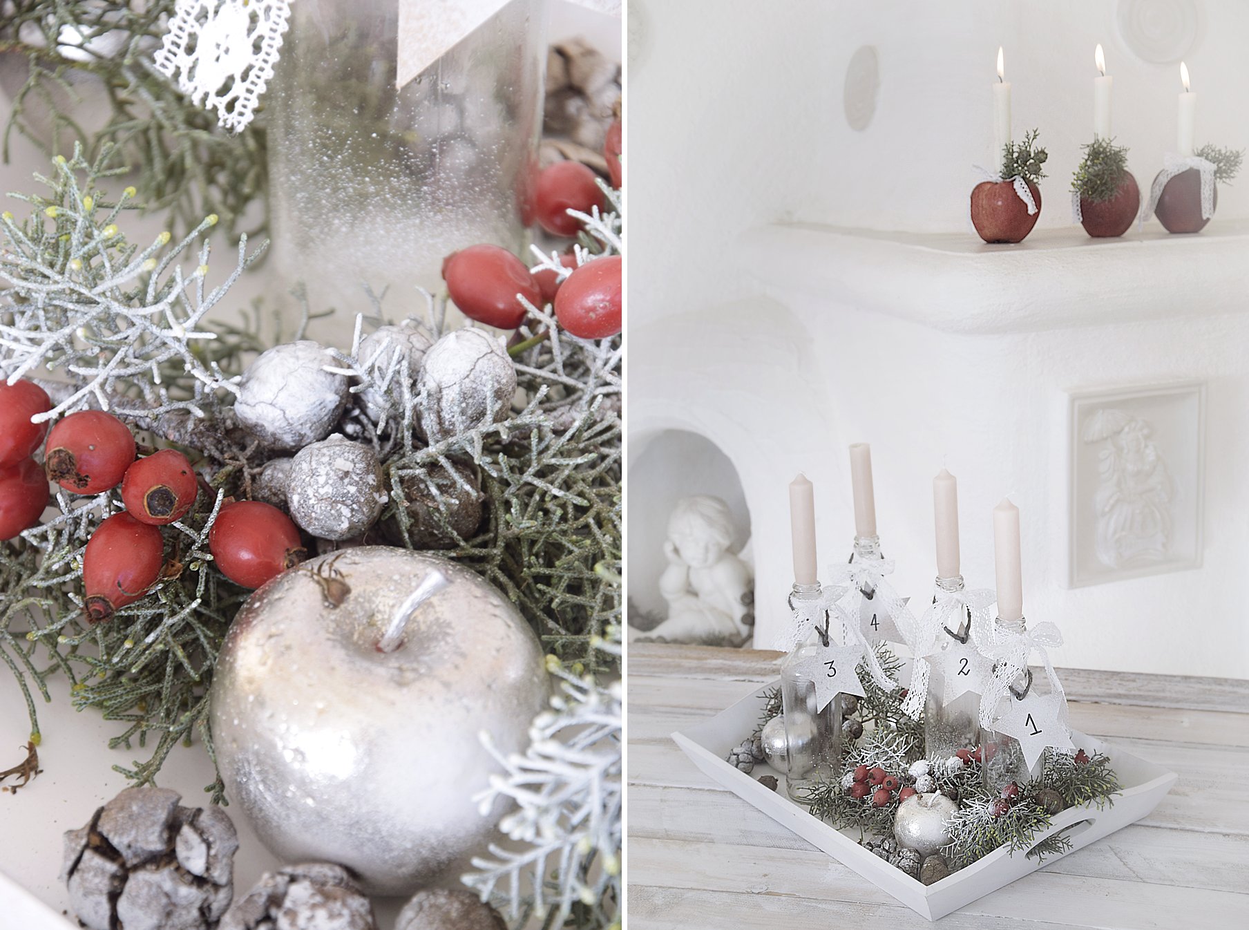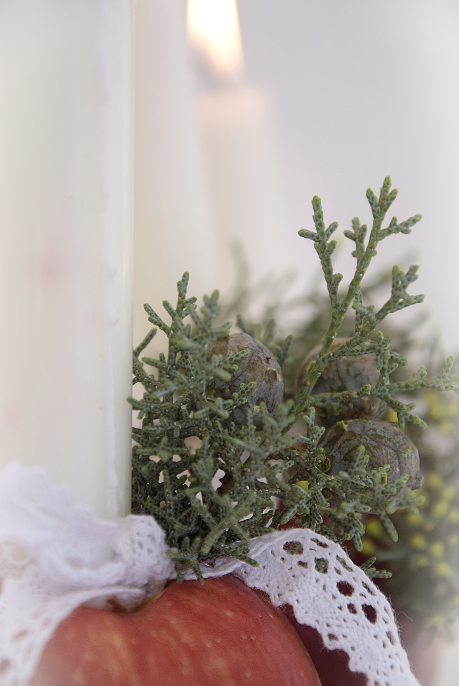 Da ich noch ein wenig Tannengrün und Spitzenband übrig hatte, habe ich noch diese wunderhübschen Apfelkerzen gebastelt. Einfach mit einem Kernausstecher eine Öffnung für die Kerzen stechen. Kerzen in den Apfel stecken und mit einem kleinen grünen Zweig verzieren. Um die Kerzen ein Spitzenband binden.
