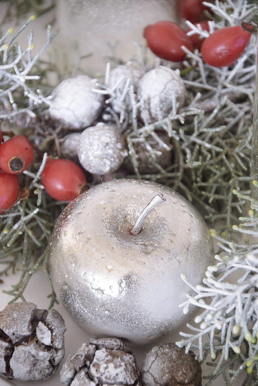 Zu den Hagebutten gesellen sich noch ein paar Zypressenzapfen. Die drei silbernen Äpfel verleihen dem Ganzen eine elegante Note. Solche Äpfel erhält Ihr in Bastel- oder Dekogeschäften.