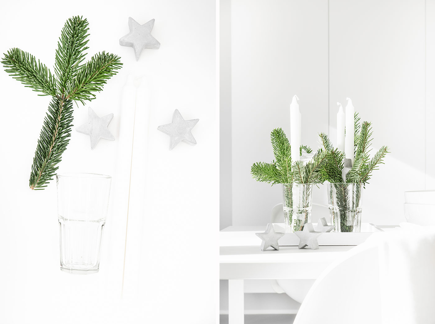 Eine einfache Variante ist es, frisch zugeschnittene Tannenzweige und je eine Stabkerze in vier Gläser zu geben. Die Tannenzweige können nach Herzenslust dekoriert werden. Ob mit Weihnachtskugeln, Zimtstangen oder getrockneten Orangenscheiben. Ich habe kleine Sterne aus Beton auf die Zweige gelegt, so bleibt es puristischer.