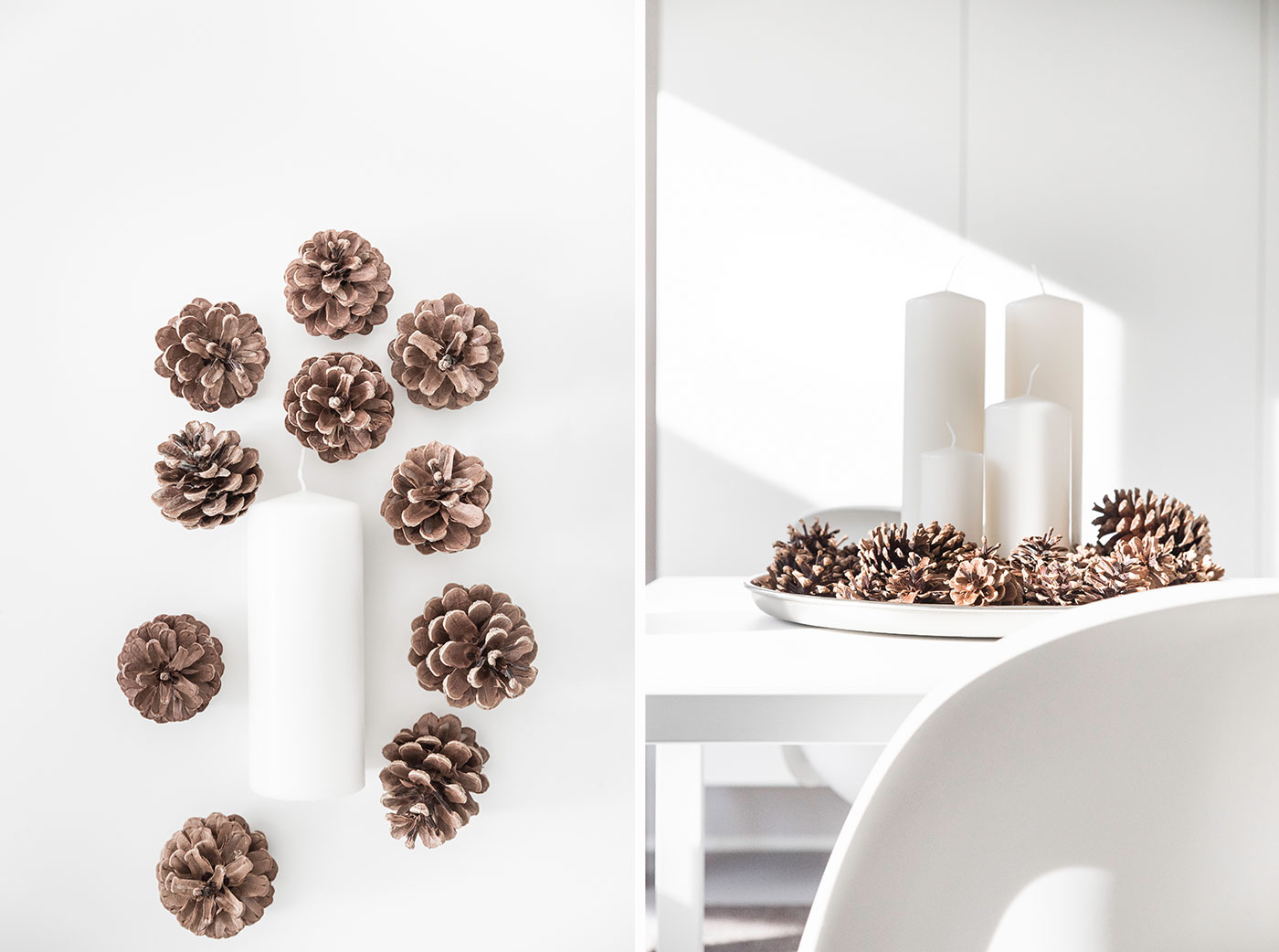 Die Stumpenkerzen, das „Silber-Tablett“ und Tannenzapfen findest Du im Onlineshop von DEPOT