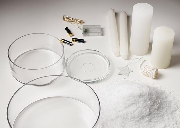 Auf den Kunstschnee in der kleinen Schwimmschale platziert ihr einen Glasuntersetzer und auf diesen wiederum die Kerzen. Fertig!