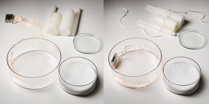 Als erstes füllt ihr die kleine Schwimmschale etwas bis zur Hälfte mit Kunstschnee auf und stell diese dann in die große Schwimmschale. In den entstandenen Raum zwischen den beiden Schalen legt ihr nun ringsum den Lichterstrang inklusive des Batteriekästchens.