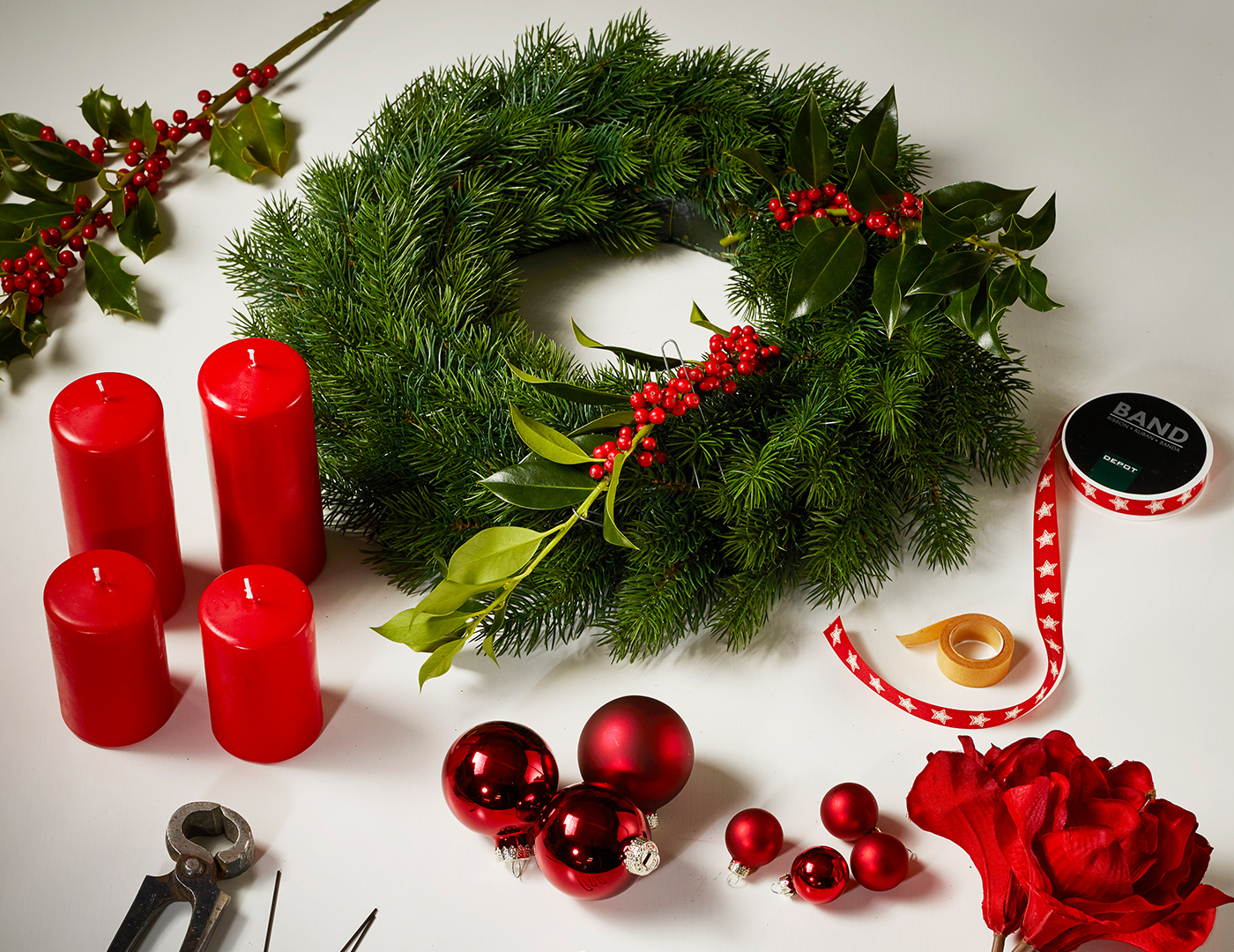 Weihnachten rückt immer näher. Das stellen wir nicht nur mit dem täglichen Blick auf den Kalender fest, sondern auch wenn wir in die Straßen und Schaufenster schauen, in welchen die Weihnachtsdeko immer mehr Raum einnimmt. Zwischen all den Tannengirlanden, Lichterketten und Kugeln scheint sich Weihnachten in den letzten Jahren zu einem richtigen Modethema gemausert zu haben. Trendfarben dominieren die Adventsdeko und Klassiker werden neu interpretiert. Da gibt es Engel, die Tüllröckchen tragen, Photo Booth Accessoires zu Nikolaus und Eukalyptus Sträucher, welchen man letztes Jahr noch keinerlei Beachtung geschenkt hat, dürfen dieses Weihnachten in keinem Kranz oder Adventsgesteck fehlen. Da vergisst man doch fast, was Tradition in der Adventszeit ist: Weihnachtssterne, Nadelzweige und vor allem Kugeln und Deko in Rot. Das haben wir uns zu Herzen genommen und so haben wir all die Klassiker auf einen Kranz gepackt.