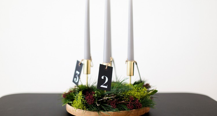 3) Die vier Kerzen in die Kerzenhalter stecken, um die Kerzen mit Hilfe der Bastschnur die vier Zahlenetiketten auf die Kerzen binden.