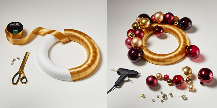 Bevor ihr richtig loslegen könnt, muss der Styropor-Ring mit einem Geschenkband umwickelt werden. Am besten wählt ihr eines, das zur Farbe der Kugeln passt, falls am Ende das Band an einigen kleinen Stellen unter den Weihnachtskugeln durchblitzen sollte. Den Anfang und das Ende des Bandes fixiert ihr mit einer Reißzwecke am Styroporkranz. Durch das Umwickeln wird der Heißkleber besser halten, mit welchem ihr im nächsten Step die Kugeln befestigt.