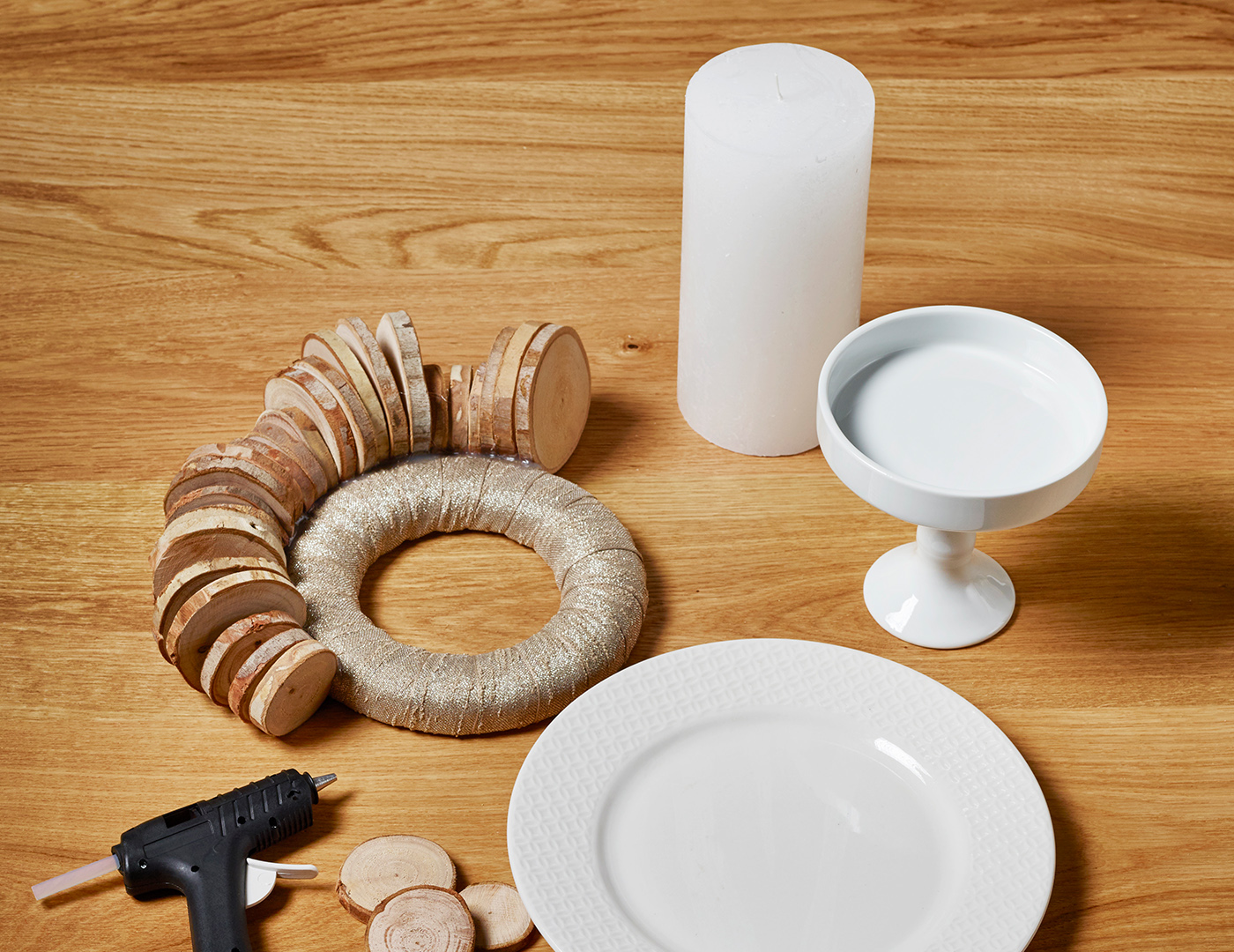 Wenn alle Holzscheiben aufgebraucht und der Kranz ringsum bestückt ist, heißt es warten. Für das weitere Dekorieren sollte der Heißkleber gut durchgetrocknet sein, damit nicht doch noch Teile verrutschen.