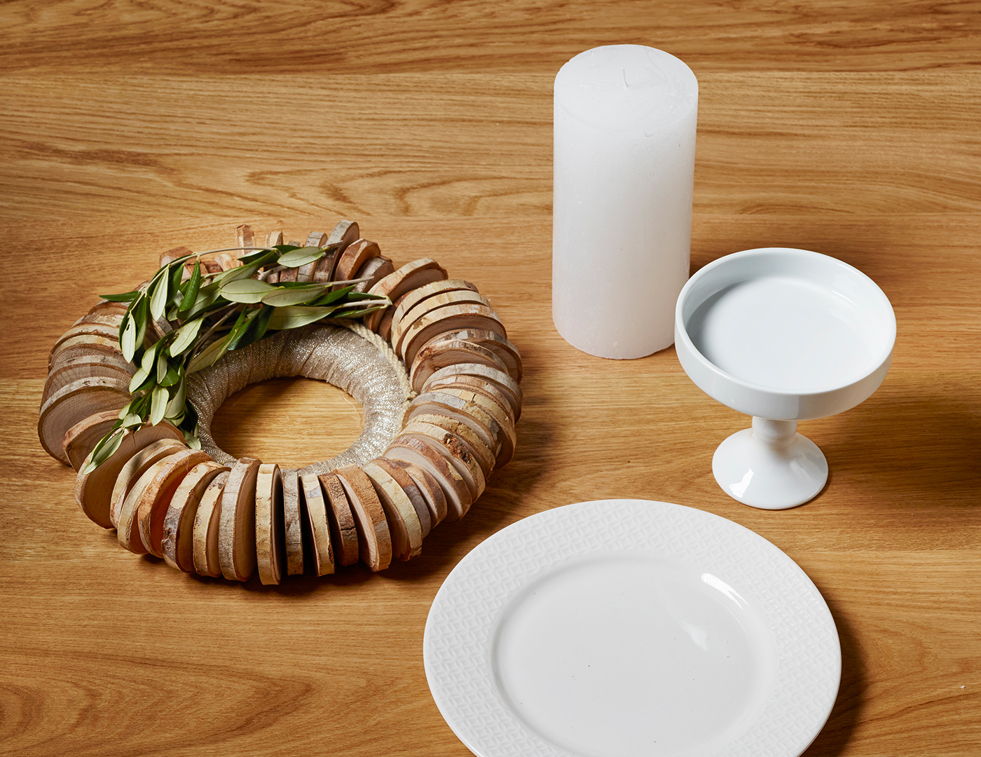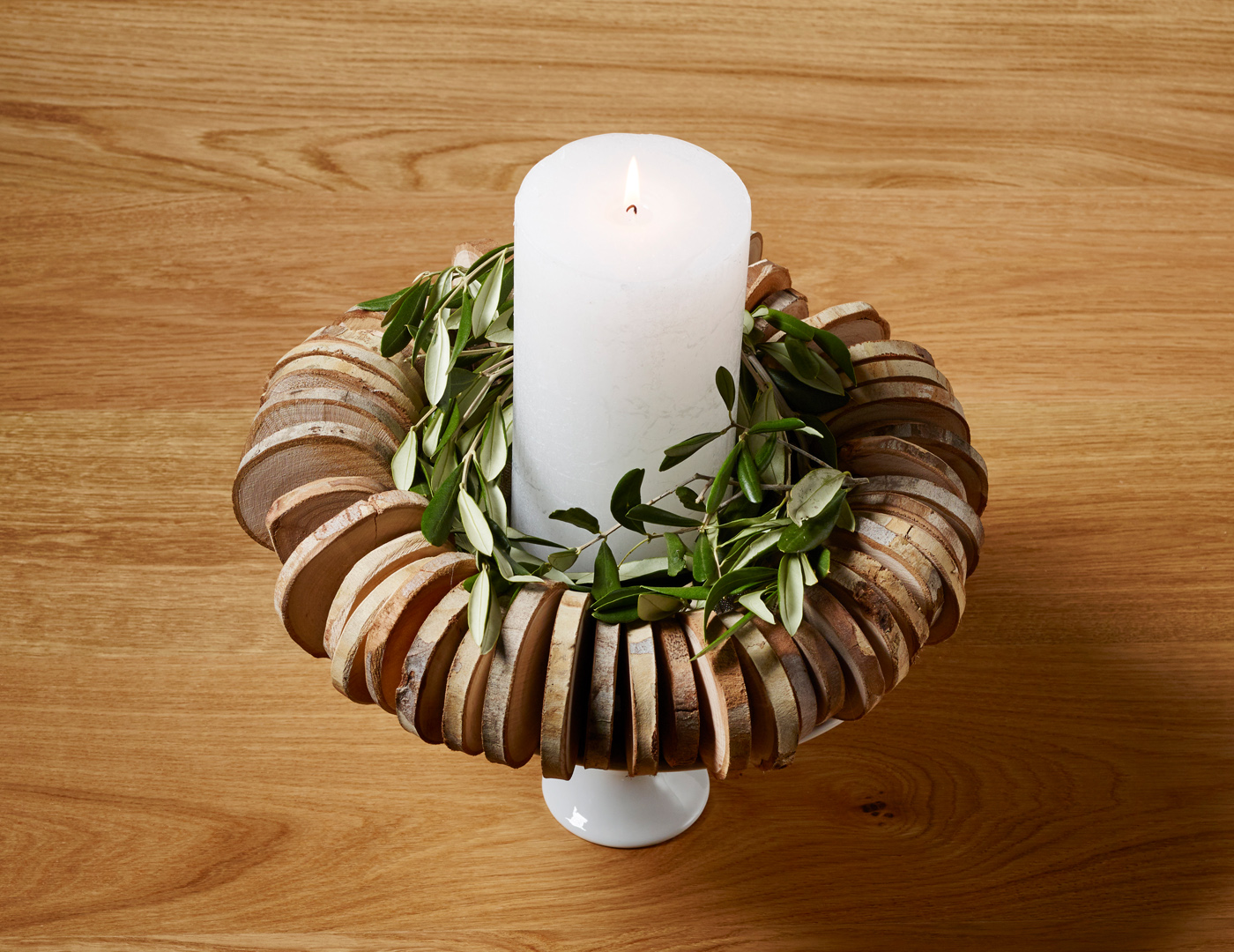 Den Kranz mit den Astscheiben legt ihr nun auf den Teller und stellt die Kerze in die Mitte. Den Raum zwischen Kranz und Kerze füllt ihr mit Mistelzweigen auf. Zuletzt gebt ihr dem Adventskranz noch ein Podest und stellt ihn samt dem Teller auf einen Porzellanfuß. Fertig!