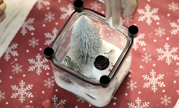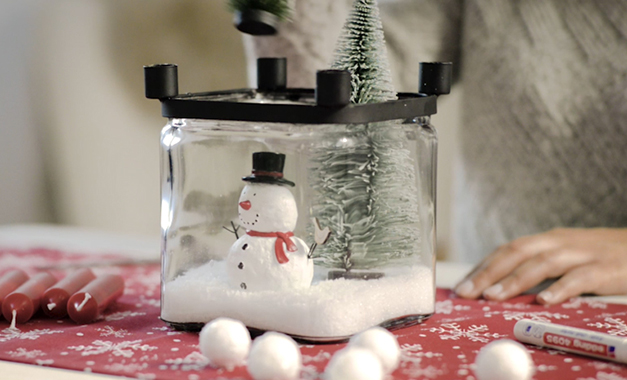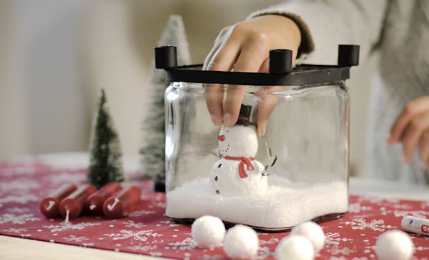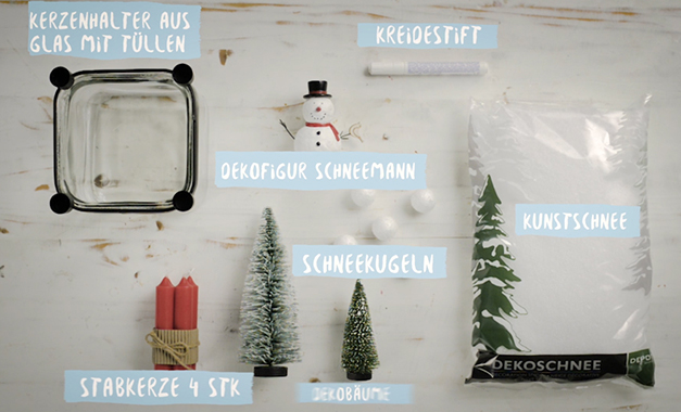 Schüttet eine kleine, aber ausreichende Menge Kunstschnee in das Glasgefäß, sodass die Dekoobjekte anschließend einen sicheren Halt haben. Verteilt den Schnee gleichmäßig und setzt die Schneemannfigur an den vorderen Rand des Glases.