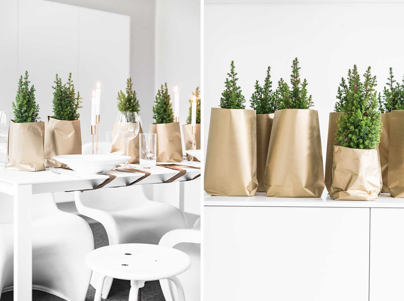 • Kleine Koniferen nutze ich als Tischbäume, Tannengrün sollte doch bei einer weihnachtlichen Tischdeko nicht fehlen. Da ich keine golden Blumentöpfe besitze, habe ich einfach aus dem goldenen Geschenkpapier passende Tüten gefaltet und die Bäume samt einfacher Übertöpfe in die Tüten gegeben. Die Tannenbäume stehen leicht versetzt auf der imaginären mittleren Längsachse des Tisches.