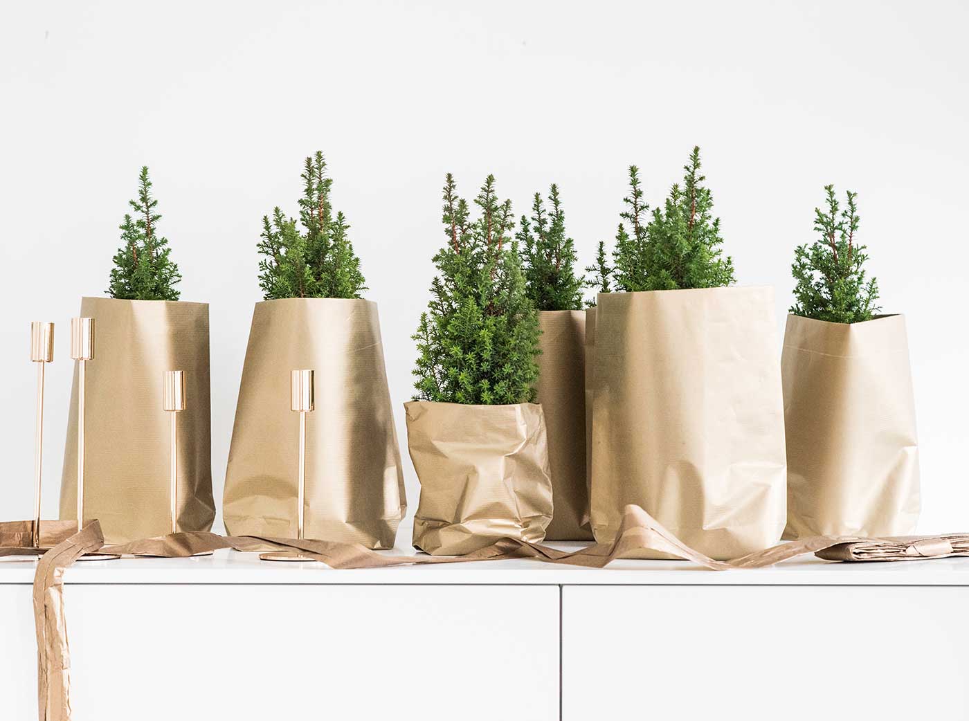 • Die goldenen Kerzenhalter in zwei Größen stehen in Zweiergruppen zwischen den Bäumen. Weiße Kerzen sorgen für den festlichen Lichterglanz. Damit die Kerzen fest im Kerzenhalter stehen, können sie mit Wachsplättchen in der Einstecktülle festgeklebt werden.