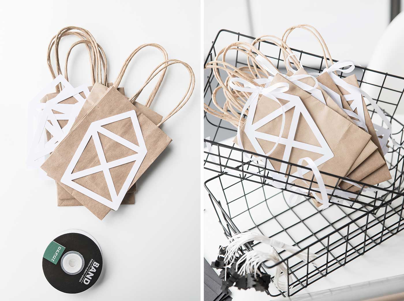 Damit aus den schlichten Geschenktüten aus Packpapier auch passende Nikolaustüten werden, habe ich aus Papier „Das Haus vom Nikolaus“ ausgeschnitten und mit einem Geschenkband an einen Henkel der Papiertüte gehängt. Damit der Geschenkanhänger vervielfältigt werden kann, empfiehlt es sich, eine Schablone anzufertigen, mit der weitere Nikolaushäuser auf Pappe übertragen werden können. Die aufgezeichneten Vorlagen kann man mit dem Cutter oder einer Schere ausschneiden. Das Schleifeinband wird um eine Dachstrebe gelegt und an den Tütenhänkel mit einer Schleife festgebunden. Du findest auch fertige Tüten im Onlineshop von DEPOT – Tütenset – Nico!