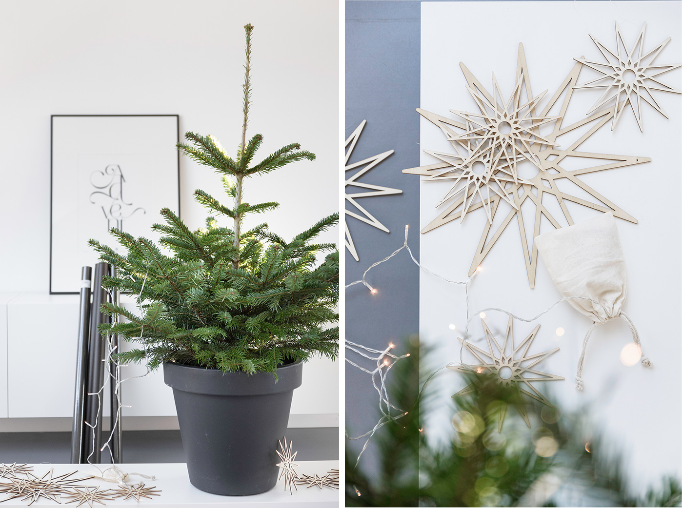 Für meinen Tannenbaum habe ich schlichte Holzsterne von DEPOT besorgt. Ich mag die gewachsene Holzstruktur sehr gerne und ich finde, die Sterne passen wunderbar in das neue Lifestyle-Konzept: natürlich und schlicht. Die Sterne sind sehr filigran und wirken auf den ersten Blick wie Strohsterne. Der Baumschmuck wird mit einem Nylonfaden an die Zweige gehängt, es scheint, als würden die Holzsterne schweben. Vor dem Schmücken habe ich die Lichterkette in den Baum gelegt. Die Lichterketten mit Batteriebetrieb sind da äußerst praktisch. Das Fach für die Batterien steckt in einem Baumwollsäckchen, so fällt es angenehmer ins Auge.