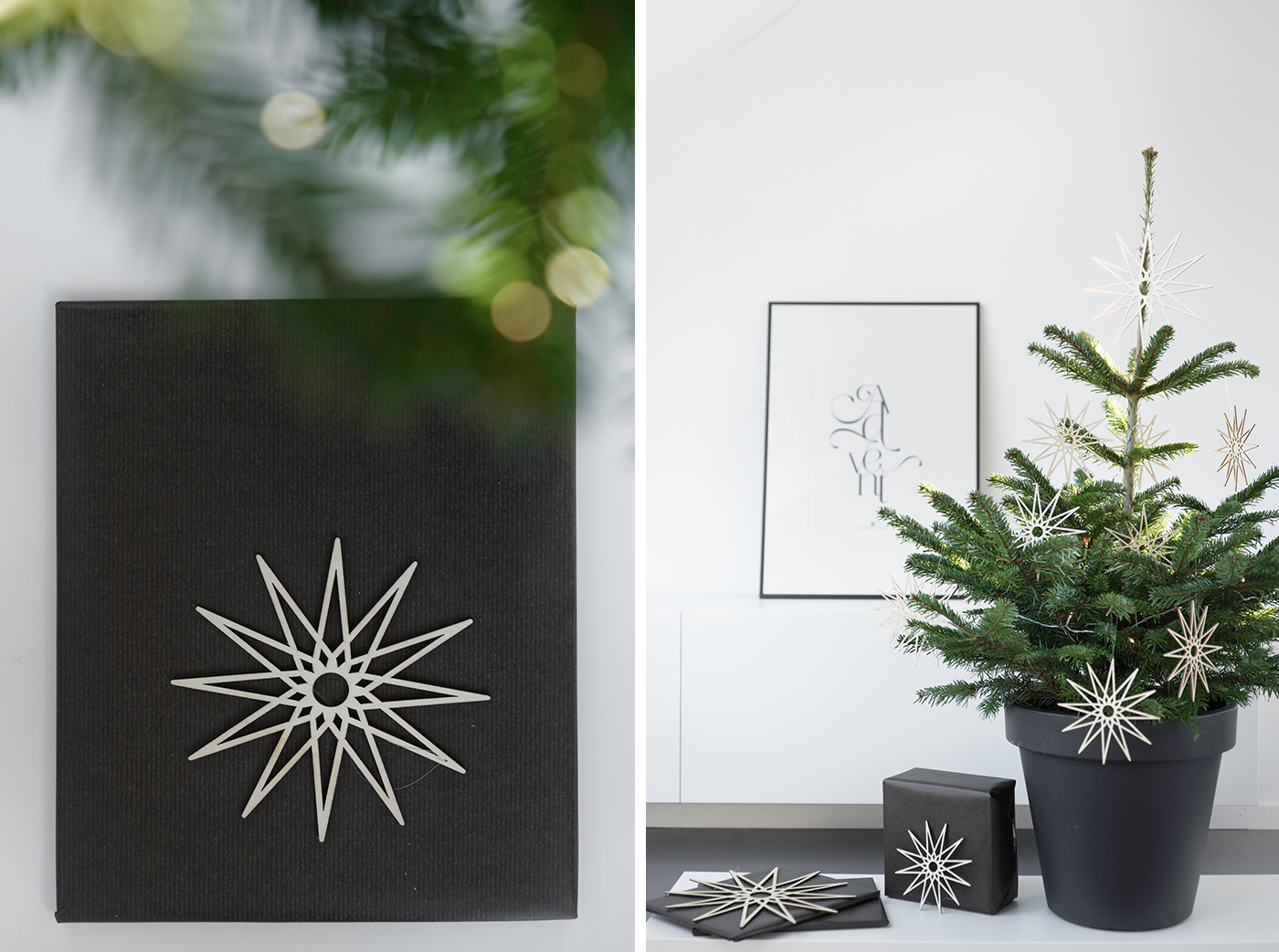 Die Geschenke packe ich passend zur Baumdeko ein. Verpackt sind sie in schwarzem Packpapier, das gibt es in den DEPOT Filialen. Ganz simpel habe ich die filigranen Holzsterne mit doppelseitigem Klebeband auf die Geschenke geklebt. Damit auf keinen Fall Stress aufkommt, fange ich rechtzeitig an, die Geschenke zu verpacken. Wir wollen ja nicht aus dem Lot geraten, denn unser neues Lebensmotto heißt doch „Lagom“!