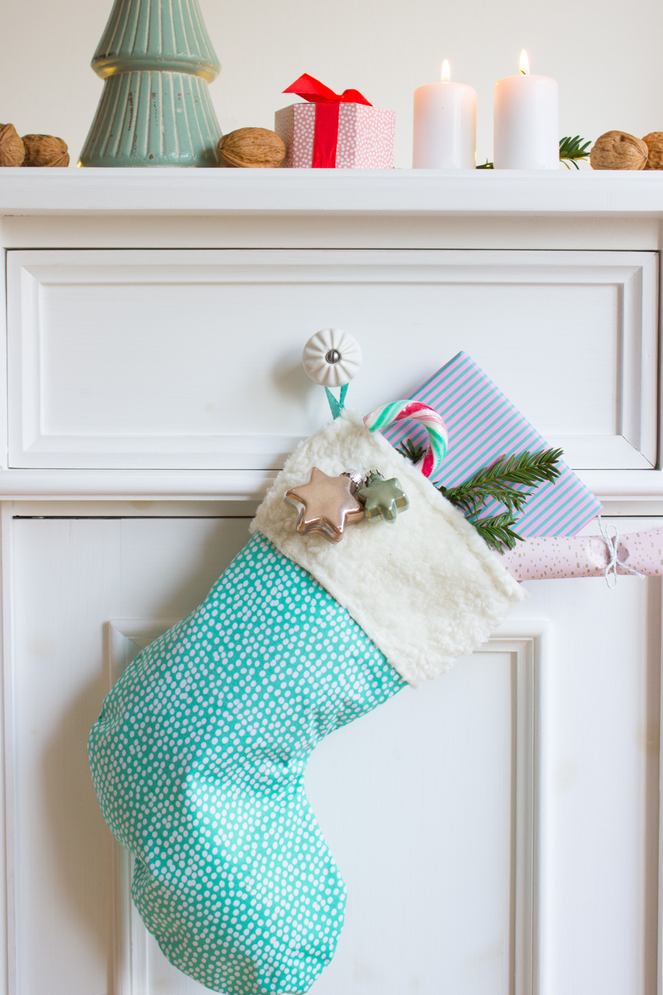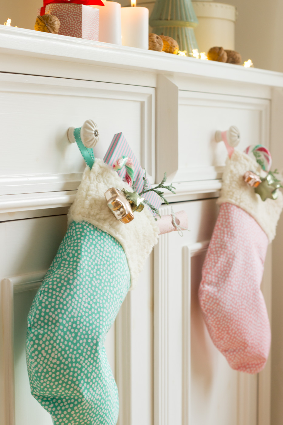 Es ist ebenso weit verbreitet, Strümpfe an den Kamin zu hängen, weil der Nikolaus auch gern mal durch den Kamin kommt, um diese mit Gaben zu füllen. Bei uns kommt natürlich die Stiefelvariante zum Einsatz, aber als kleine Absicherung werden zusätzlich noch fix genähte Nikolausstrümpfe hin gehängt, die sich auch als Geschenkidee und hübsche Adventsdekoration sehr gut machen.