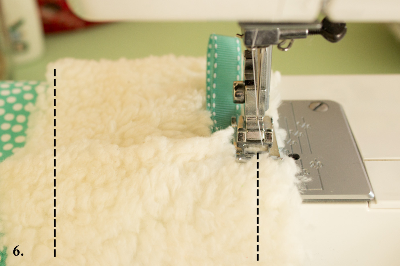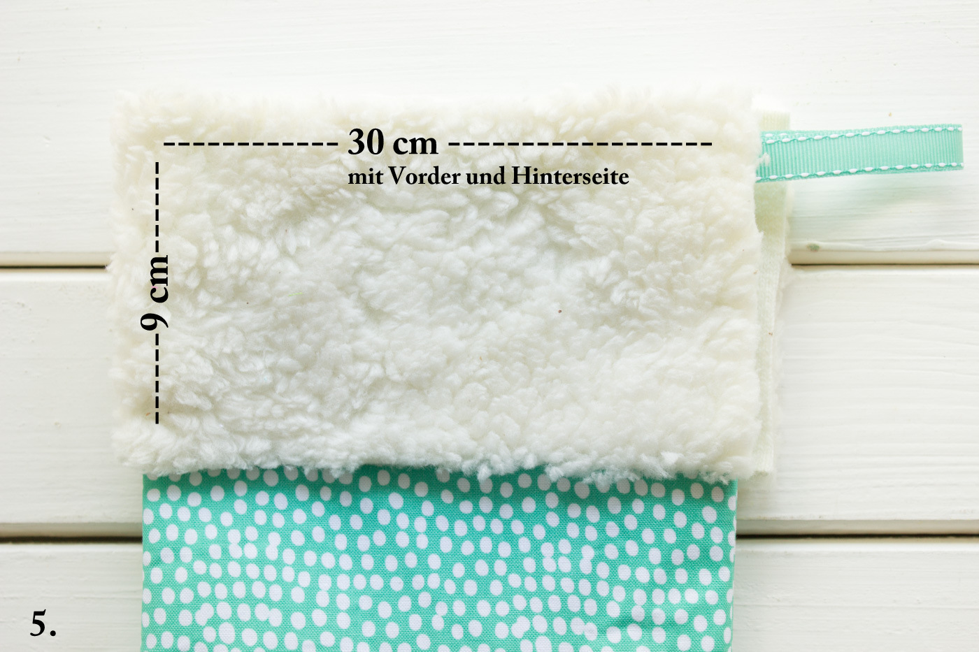 Schritt 6: Jetzt könnt Ihr das Stück Kuschelfell am Stoffstiefel festnähen. Den Anfang und das Ende habe ich per Hand mit ein paar Stichen zusammen genäht.