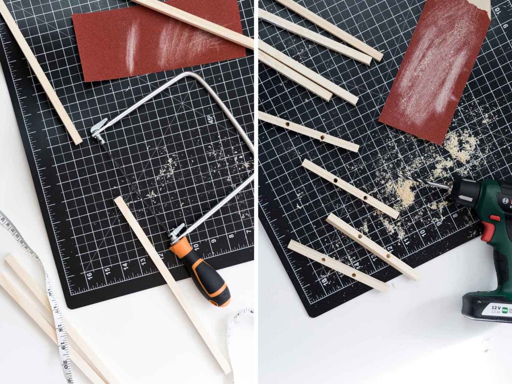 Wenn ihr die richtigen Maße gefunden habt, müsst ihr insgesamt 12 Leisten mit drei verschiedenen Längen sägen.