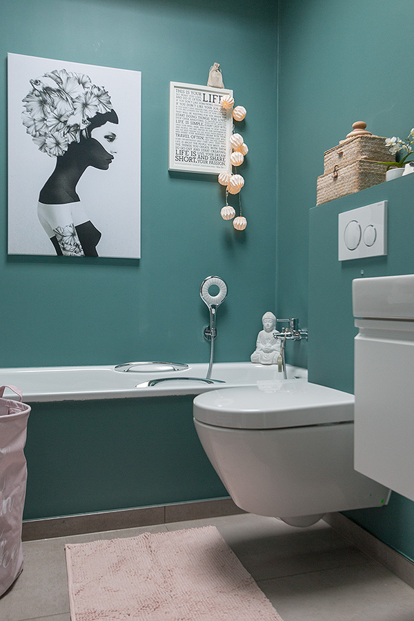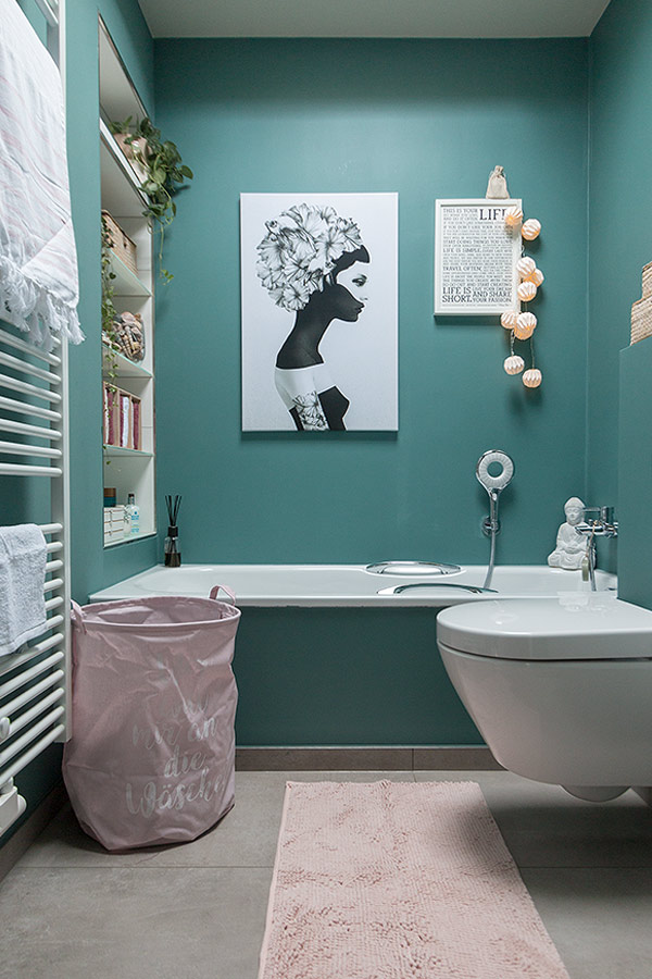 Mein kleines Badezimmer trägt schon seit dem Einzug die Farbe türkis. Ich finde diese Farbe einfach herrlich erfrischend! Bisher habe ich das Bad mit Natur- und Grautönen dekoriert. Nun wird es allerdings Zeit für etwas Neues. Rosa- und Beerentöne bringen den Frühling ins Bad. Grünpflanzen sorgen für ein gesundes Raumklima. In offenen Kisten lassen sich Gästehandtücher hübsch arrangieren, in Geschlossenen allerlei Dinge verstauen, die nicht ansehnlich sind. Muscheln in Glasvasen lassen einen an den letzten Sommerurlaub denken. Lichterketten bringen Gemütlichkeit in die Wohlfühloase.