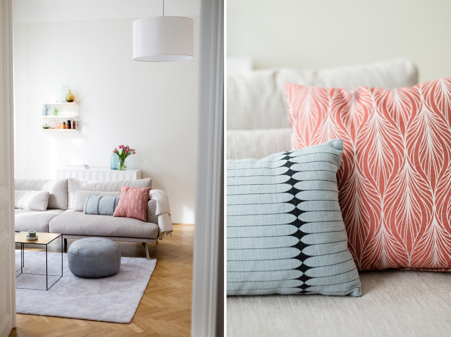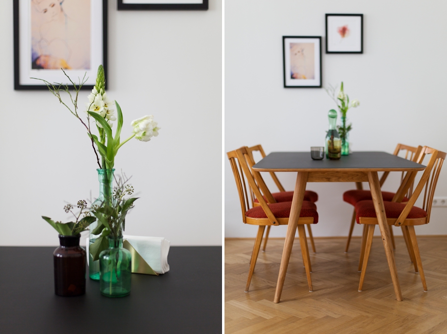 Links vom Sofa steht der Esstisch mit den Retro Stühlen aus den 50igern. Gefunden bei einem Flohmarkt Store hier in Wien, sind sie ein echter Eyecatcher, weil sie komplett anders aussehen als der Rest. Die Kissenbezüge werden bei Gelegenheit noch gegen welche in Blau getauscht. Ich arrangiere immer gern ein paar meiner Vasen auch am Esstisch und befülle sie mit ein paar frischen Blümchen vom Blumenladen um die Ecke.
