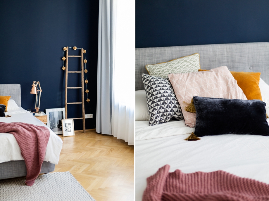 Zum Schluss nehm ich euch noch in mein Schlafzimmer mit. Das Highlight der Wohnung – allein schon wegen der auffälligen Wandfarbe. Im Schlafzimmer darf man sich ruhig trauen mal zu einer dunkleren Wandfarbe zu greifen. Ich habe schon mal in einem Posting darüber berichtet, schaut mal hier. Die Kissen auf dem Bett sind teilweise von DEPOT, momentan gibt es wunderschöne mit Paspeln, da werde ich mir auch noch eins davon zulegen. Denn eine Kissensammlerin wie ich kann nie genügend Kissen zu Hause haben :)