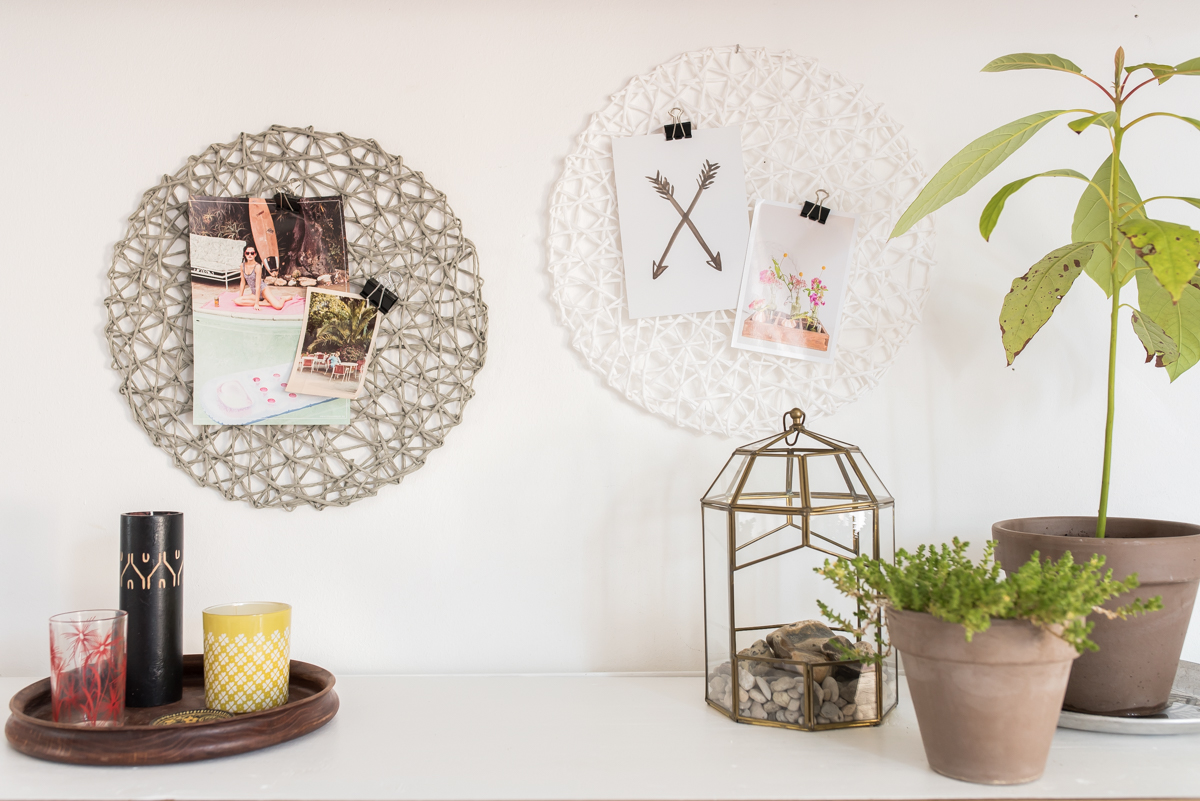 Wenn Ihr Euch nicht gleich an einer Bilderwand mit Rahmen versuchen, aber trotzdem Eure Urlaubsschnappschüsse ausstellen möchtet, pinnt sie einfach mit Klammern an Tischsets, die Ihr an die Wand hängt!