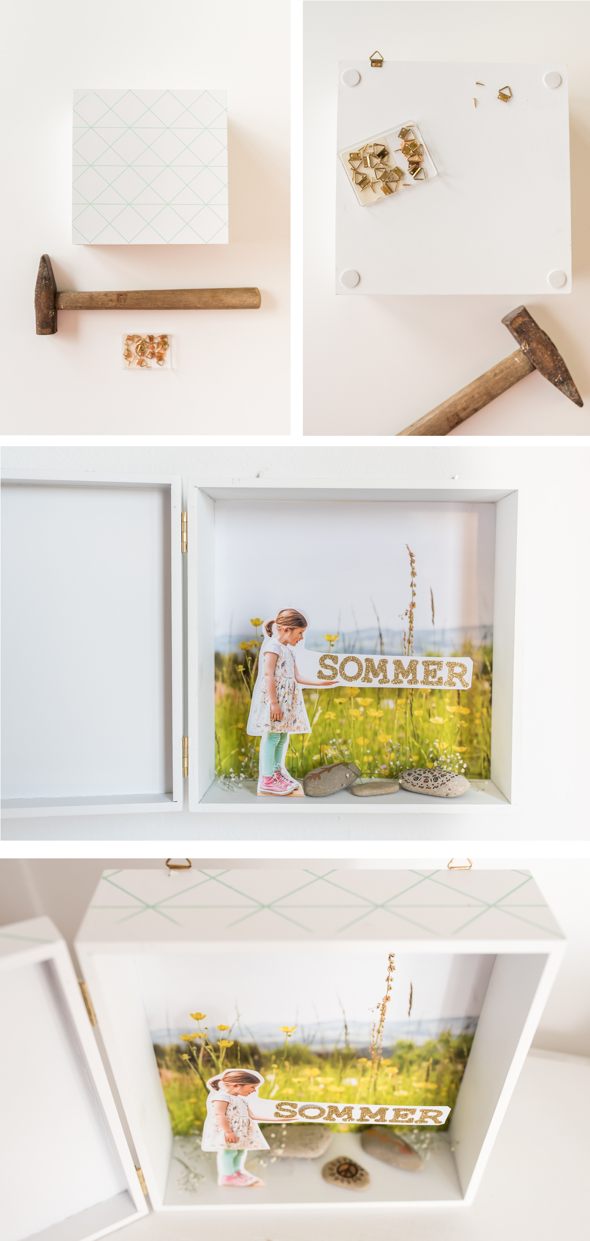 Um den Look ein wenig aufzulockern, habe ich einen Schaukasten mit 3D-Effekt selbst gebastelt. Dafür habe ich an einer Holzbox mit Deckel Bildaufhänger befestigt, sodass sich die Box wie ein kleiner Wandschrank öffnen lässt. An die Rückwand habe ich ein sommerliches Stimmungsbild geklebt und ein weiteres Foto an den Konturen ausgeschnitten und vorne an den Rand geklebt. Am besten eignen sich dafür Bilder, die vor einem neutralen Hintergrund aufgenommen wurden. Es sieht auch toll aus, wenn Ihr zur Box passend noch kleine Urlaubsmitbringsel oder Blumen ausstellt.